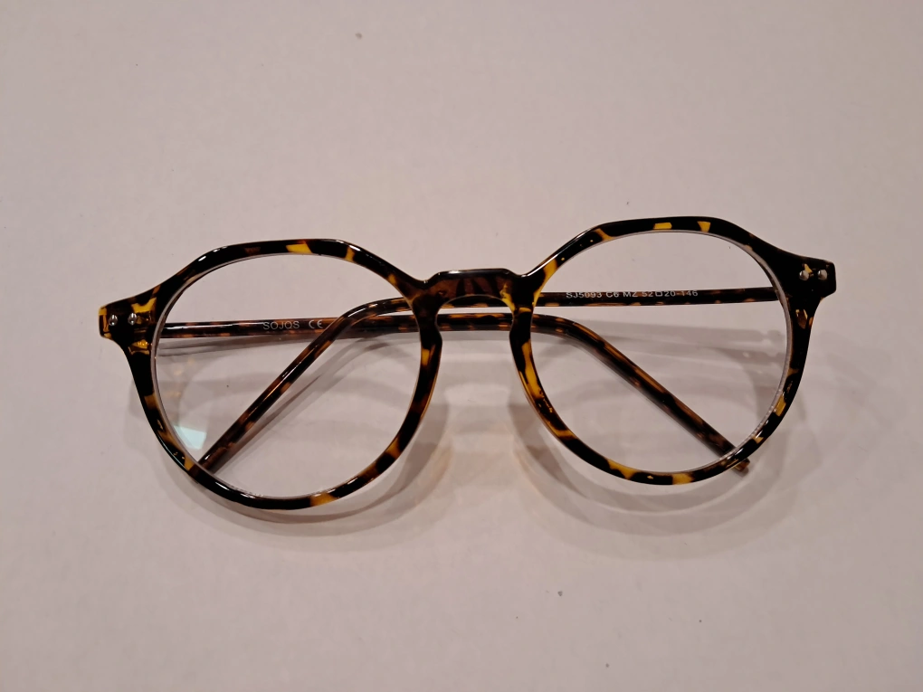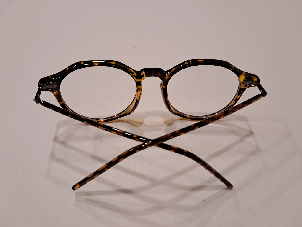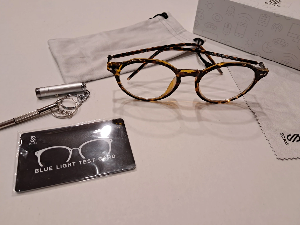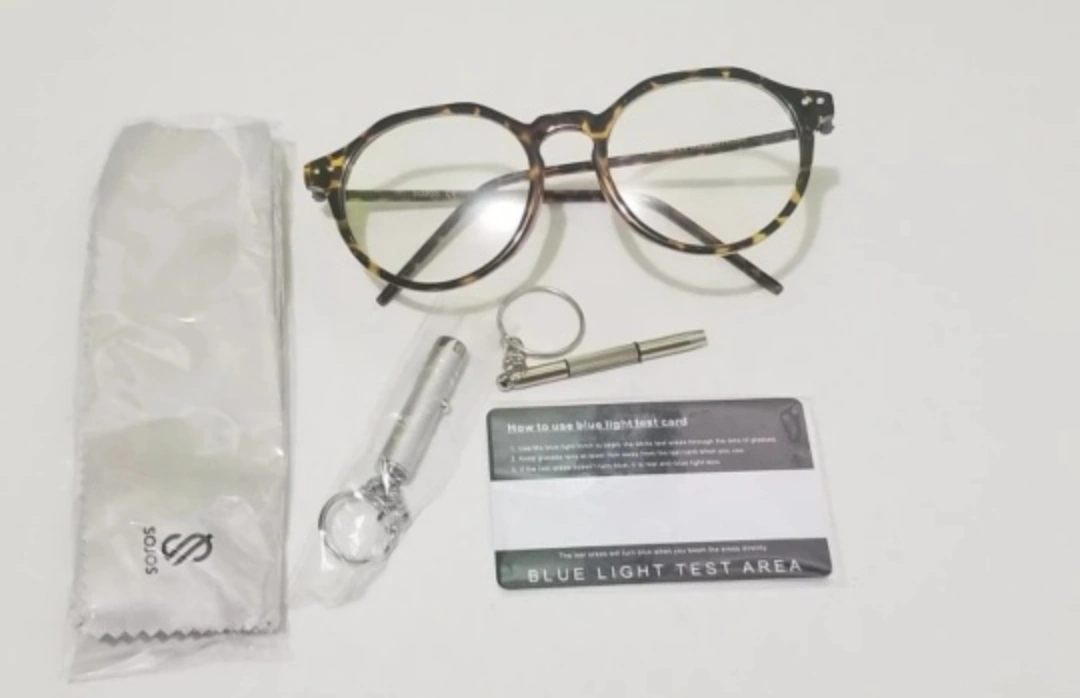 Round tortoise shell blue light glasses. Includes a cleaning cloth, case, test card, and screwdriver and blue laser