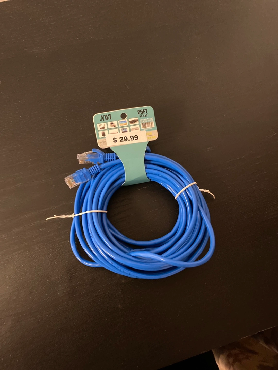 New in package, 25-foot blue ethernet cable. Never used. Great for networking. I don’t need for house to connect to Router and Computer. I have a Wi-Fi router network. I brought from Technical Guy from the Store.