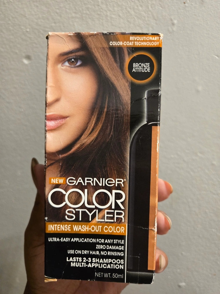 New Garnier Color Styler temporary hair color. Bronze Attitude shade. 50ml tube. Washable, lasts 2-3 shampoos. Easy application. Includes gloves and instructions. BRAND NEW AND SEALED✨️👋🏾 CURBSIDE PICK UP ONLY..✨️👋🏾