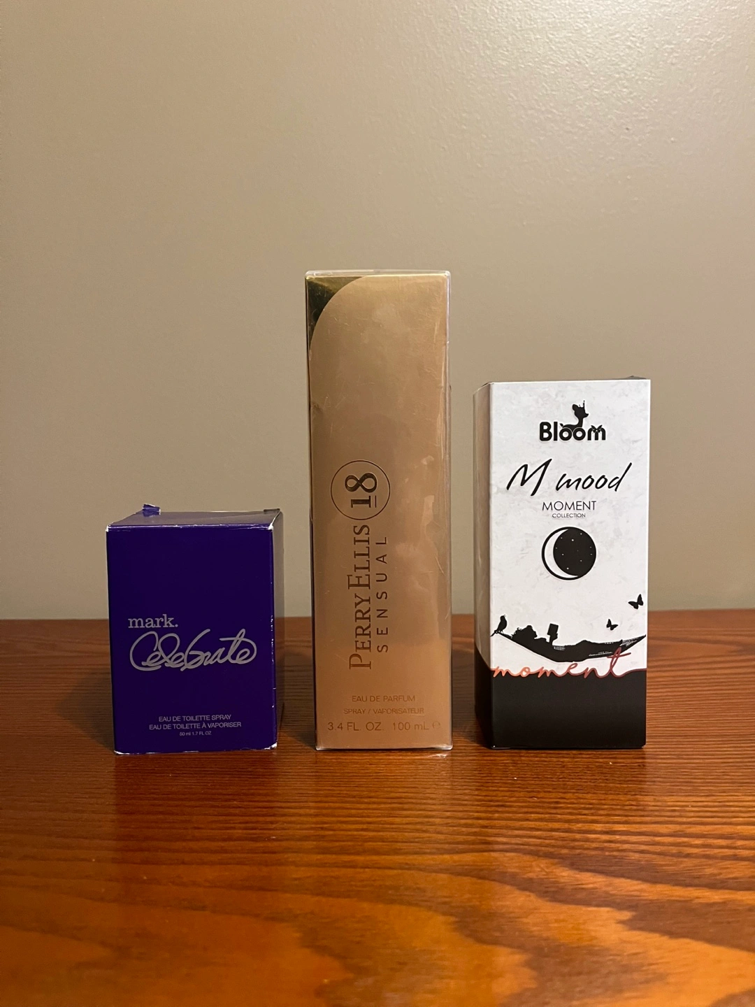BNIP Assorted EDT/EDP spray. $26 Avon (2010) Mark Celebrate Eau De Toilette spray. 50ml. $26 Perry Ellis 18 Sensual Eau De Parfum. 100ml. Sealed. $60 Bloom mood collection Moments perfume. 100ml. Brand new in box. Information is shown in the pictures. Last 2 pictures are for price reference only. Cross posted.
