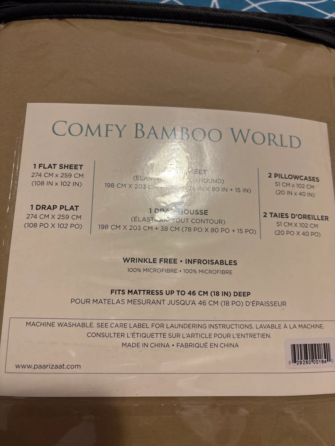 NEW in package ….Comfy Bamboo World 4 piece King sheet set, including one fitted king sheet, one flat king sheet and two king pillowcases, wrinkle free, 100% microfibre material… **pick up on Chandos Drive Kitchener