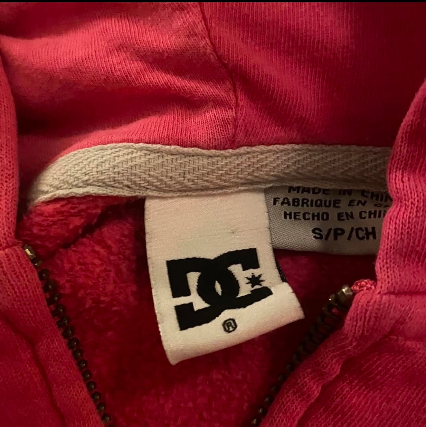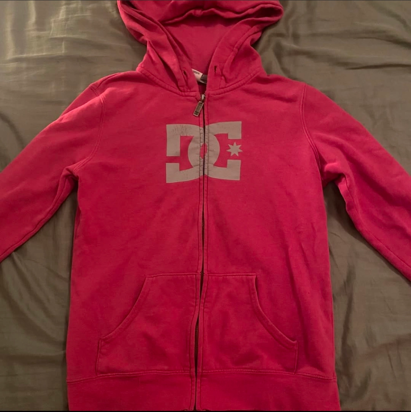 Women's pink zip-up hoodie. Features a large DC logo on the front. Long sleeves, kangaroo pocket, and a hood.