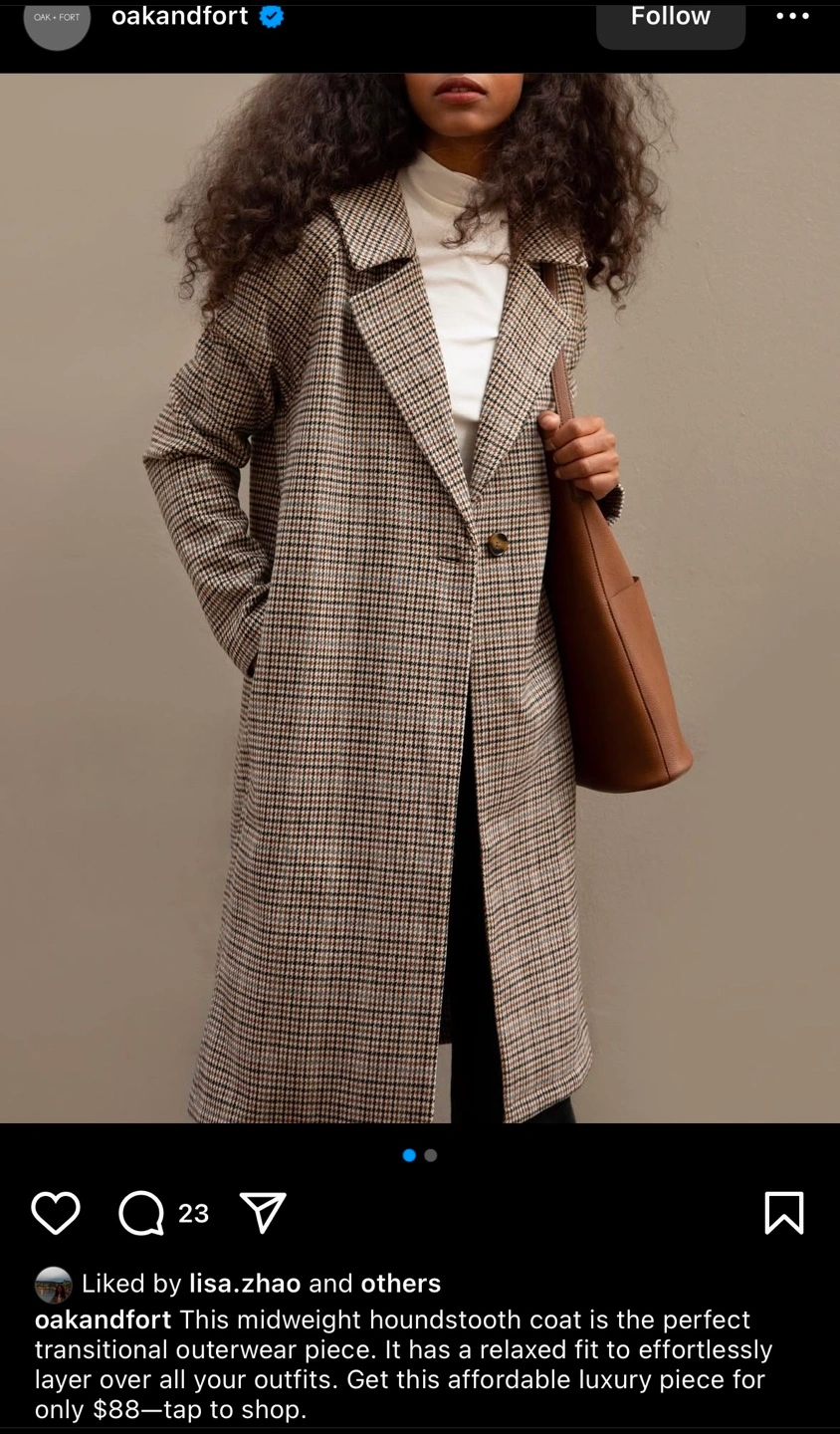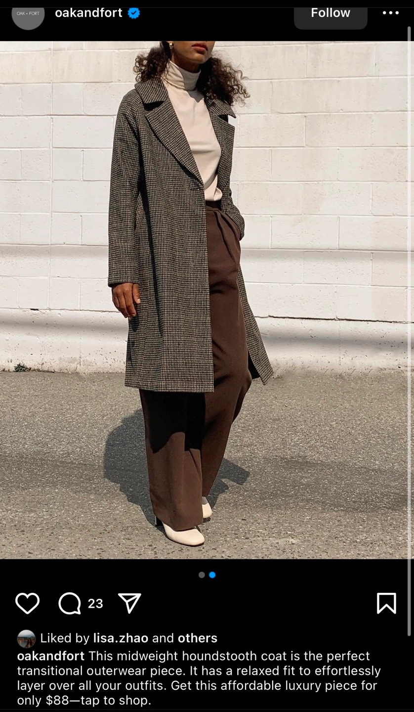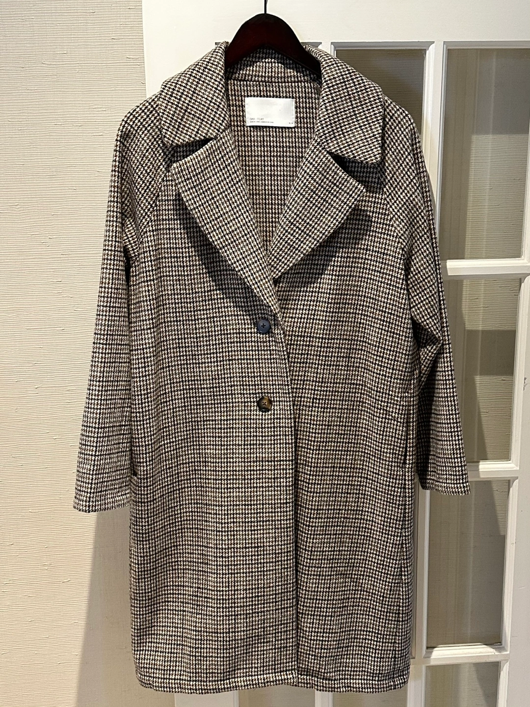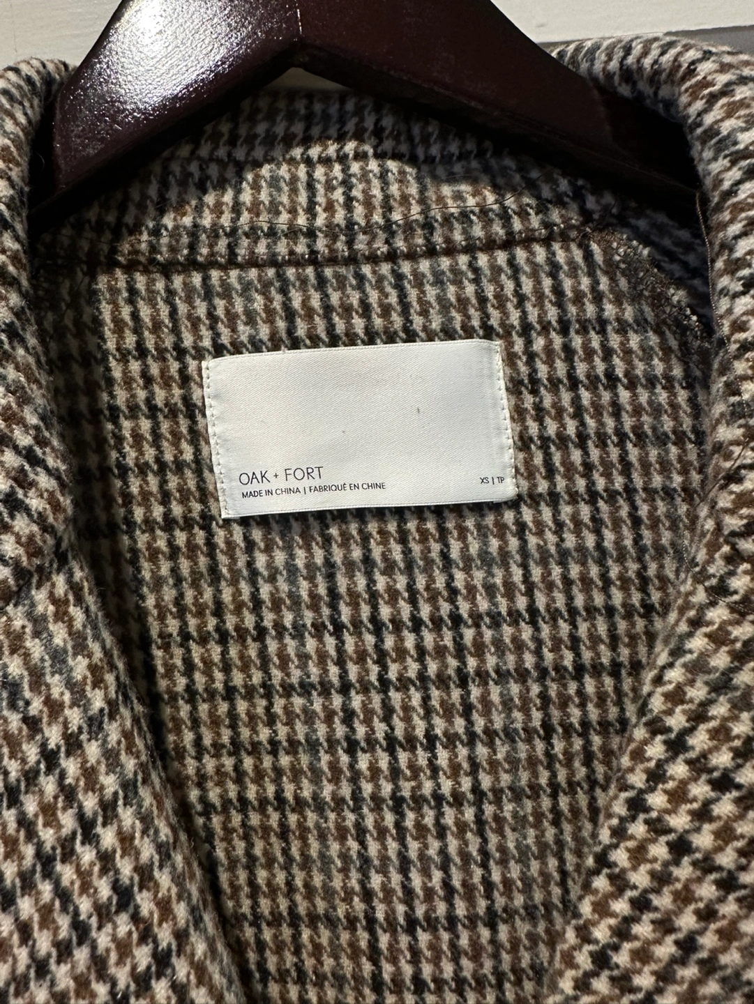 Oak + Fort houndstooth coat in gingerbread colourway Size XS has two pockets and two buttons, tag comes with a spare button if needed not work very much after purchasing so no flaws, just a little wrinkled from being in closet pick up only near oriole parkway and eglinton