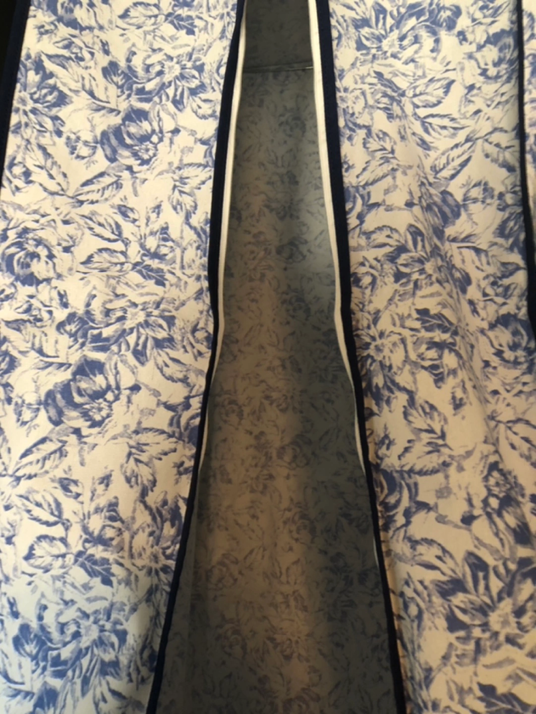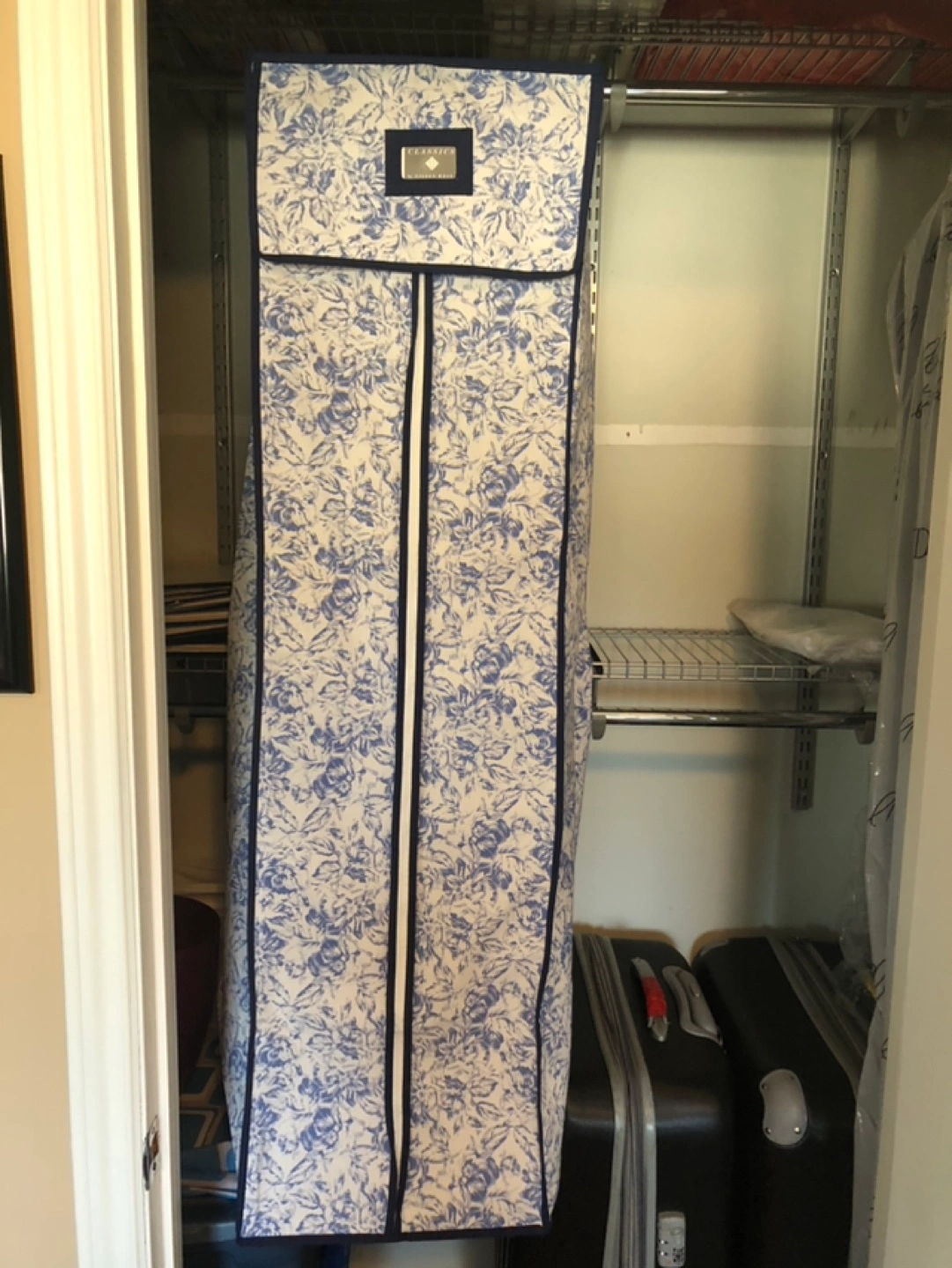 Floral-printed garment bag. Zipper closure. Hangs in closet. Ideal for storing gowns, dresses, or other long garments. New never used