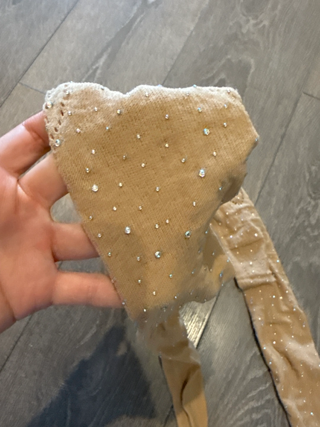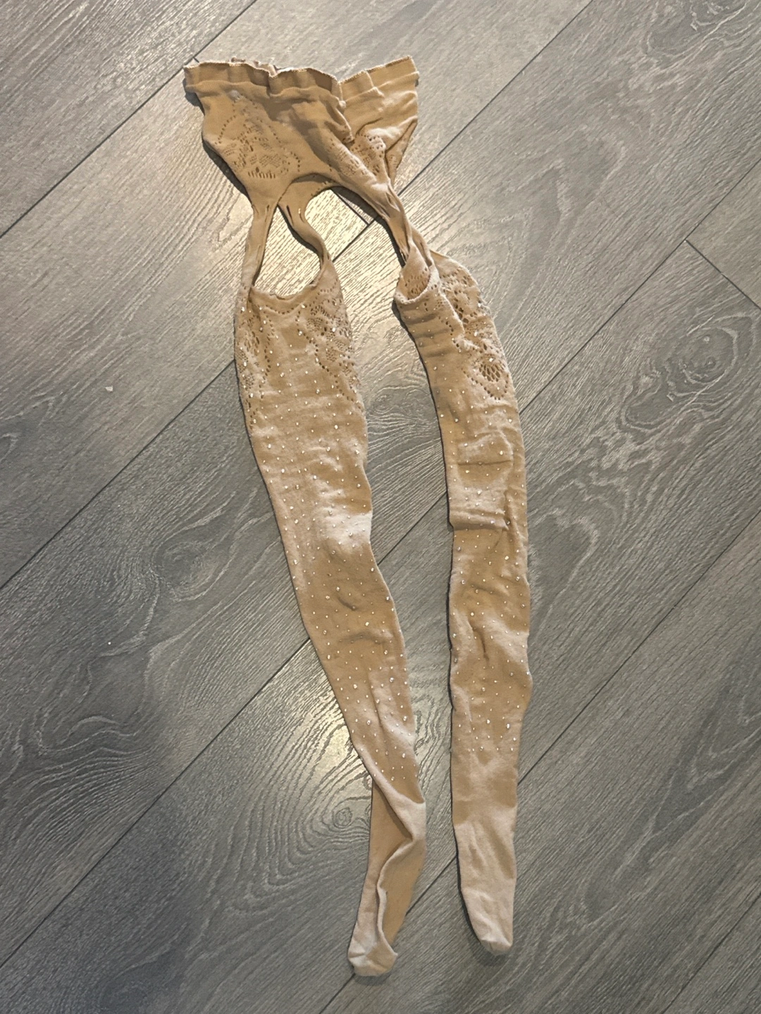 Beige fishnet tights. Embellished with rhinestones. Cut-out detailing at the thigh. Great for a special occasion. Very stretchy Brand new never worn Buy three items from my listings and get one under 10 for free! Multiple purchases come with decent discounts!
