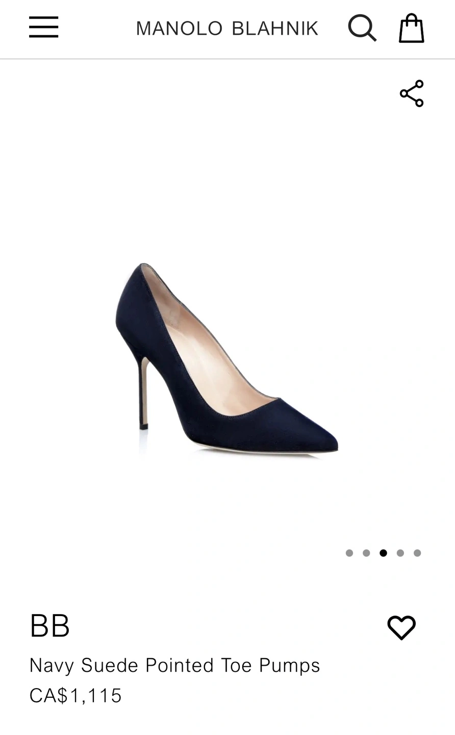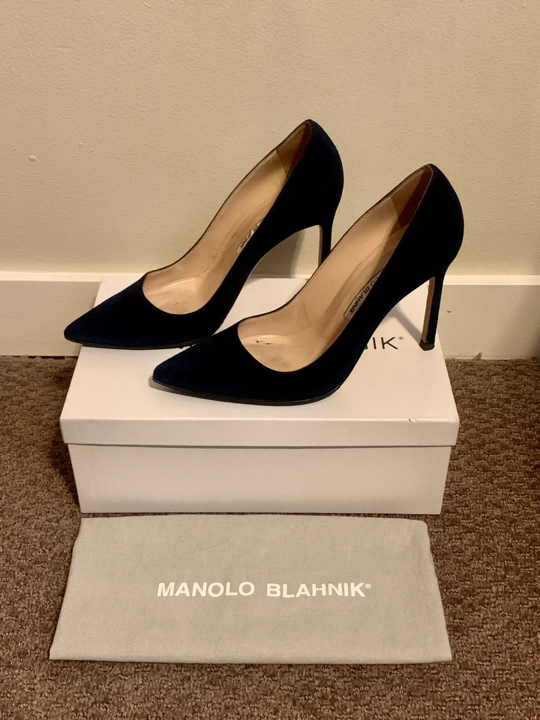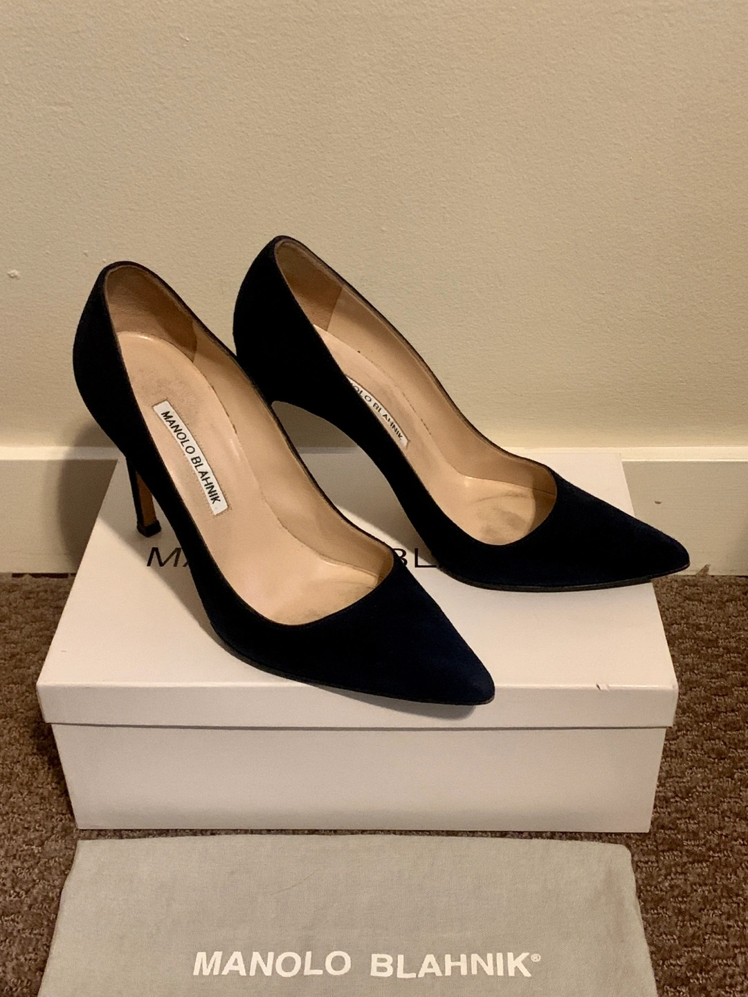 Manolo Blahnik BB 105 Navy Suede Heels size 37 Retails $1115 +tax No smoking no pets Pickup near Oakridge or Richmond centre Navy suede pointed toe court shoe with a stiletto high heel. Upper: 100% kid suede Sole: 100% cow leather Lining: 100% kid leather Heel measures 105 mm Made in Italy Story "Every season I explore and aim to achieve the perfect shape and cut for my court shoe. I first designed the 'BB', which is named after Brigitte Bardot, one of my greatest inspirations, in 2008 and it became a classic. It's a good shoe for every occasion." - Manolo Blahnik