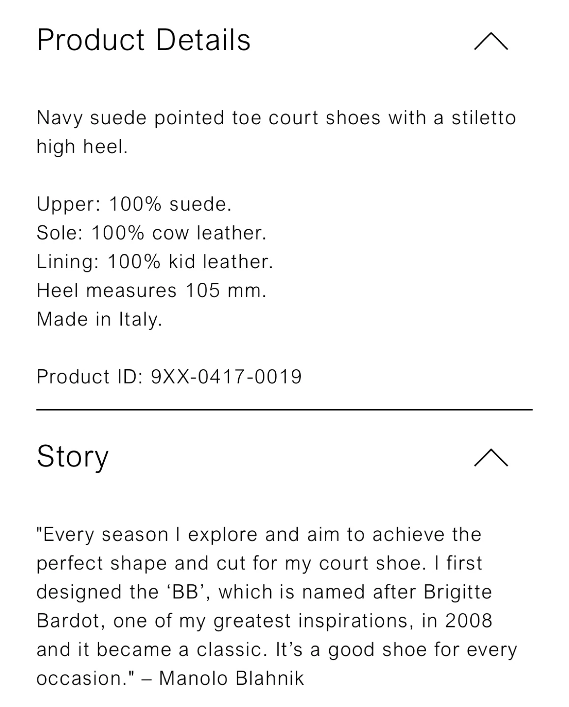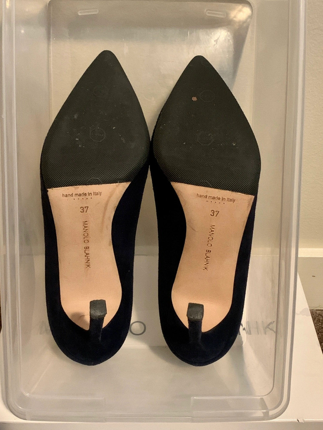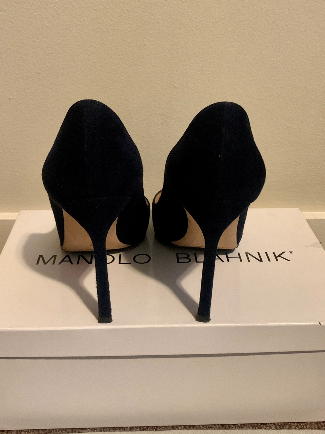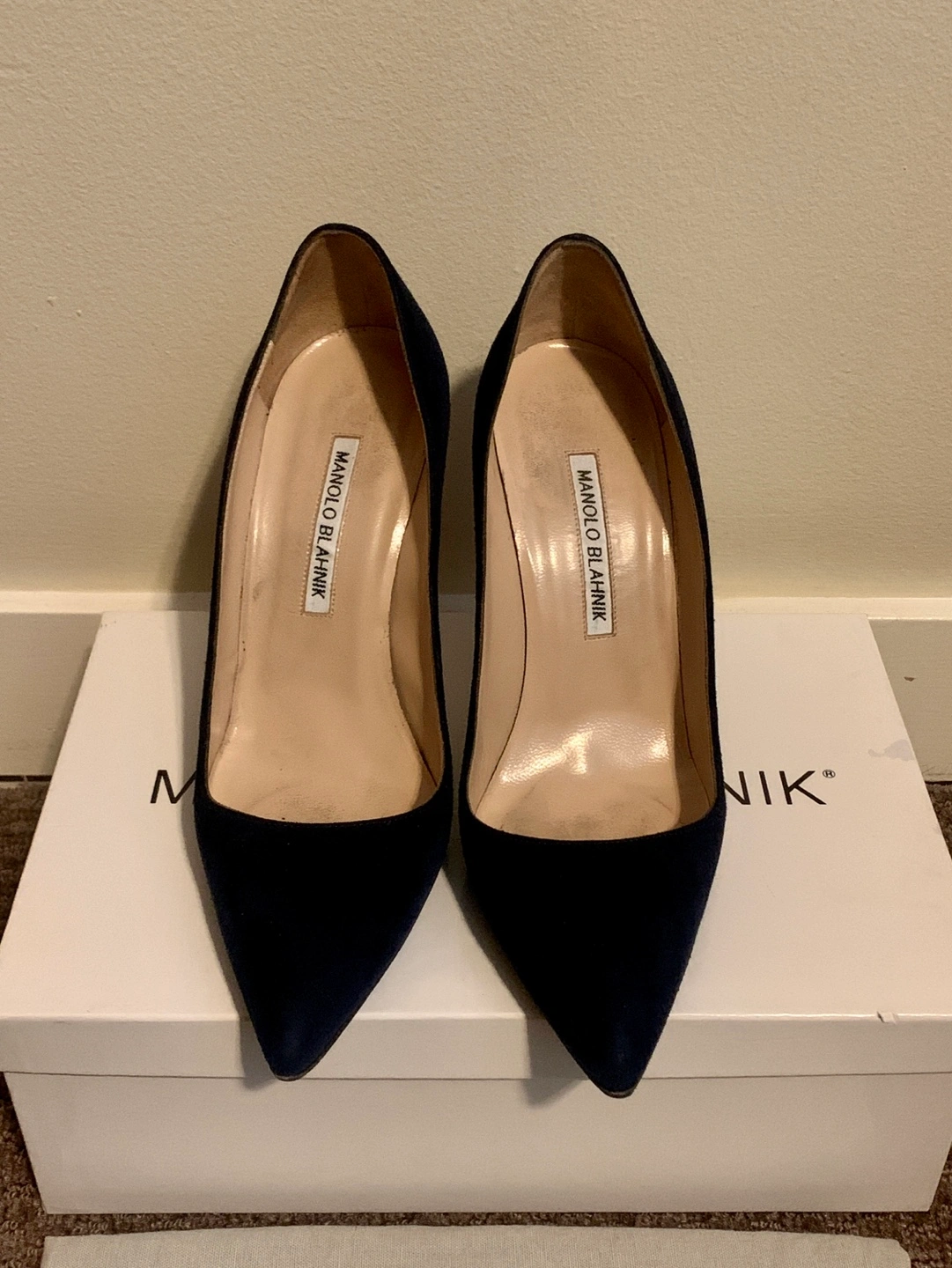 Manolo Blahnik BB 105 Navy Suede Heels size 37 Retails $1115 +tax No smoking no pets Pickup near Oakridge or Richmond centre Navy suede pointed toe court shoe with a stiletto high heel. Upper: 100% kid suede Sole: 100% cow leather Lining: 100% kid leather Heel measures 105 mm Made in Italy Story "Every season I explore and aim to achieve the perfect shape and cut for my court shoe. I first designed the 'BB', which is named after Brigitte Bardot, one of my greatest inspirations, in 2008 and it became a classic. It's a good shoe for every occasion." - Manolo Blahnik