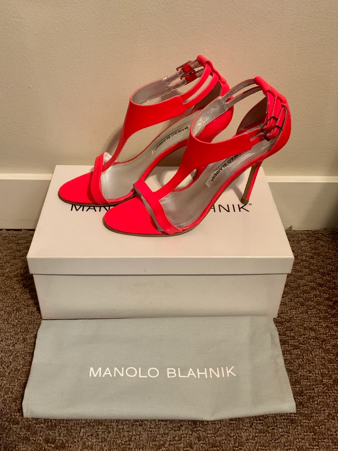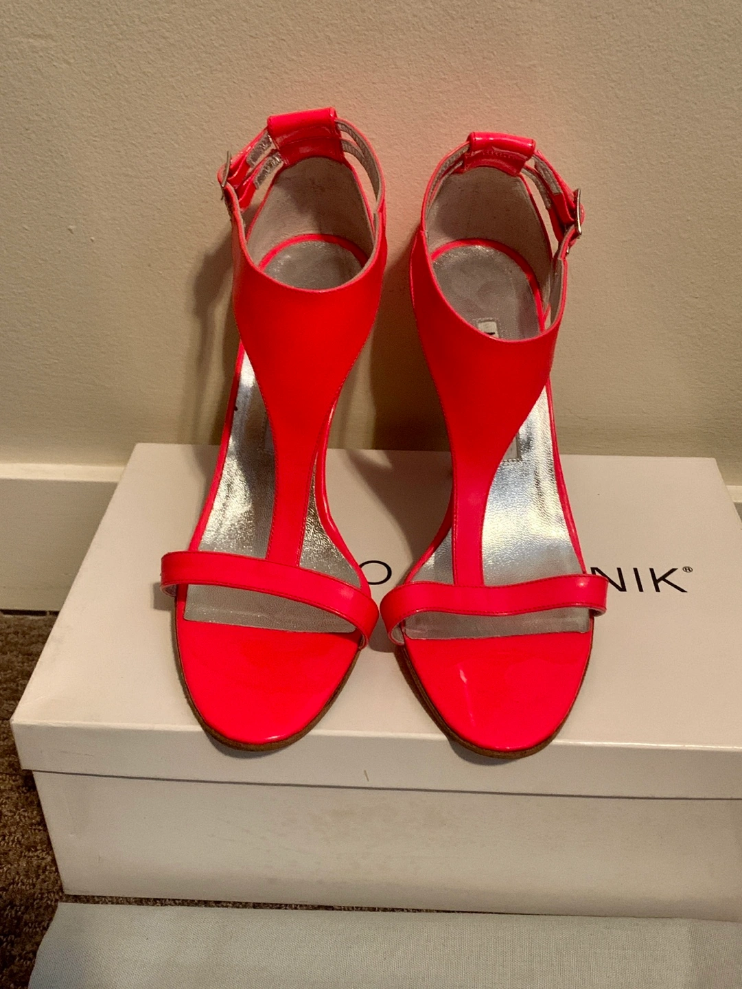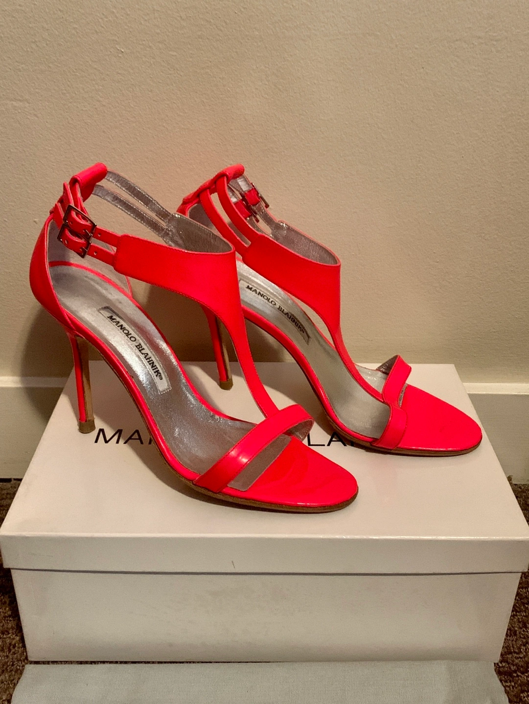 Manolo Blahnik Strittina T-strap Heels size 37 Retails $1160 +tax No smoking no pets Pickup near Oakridge or Richmond Centre Heel measures 105 mm Made in Italy Fluorescent pink patent leather Manolo Blahnik Strittina T-strap heels with silver-tone buckle closures at ankle straps.