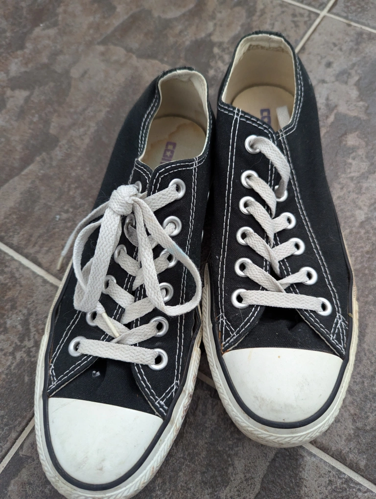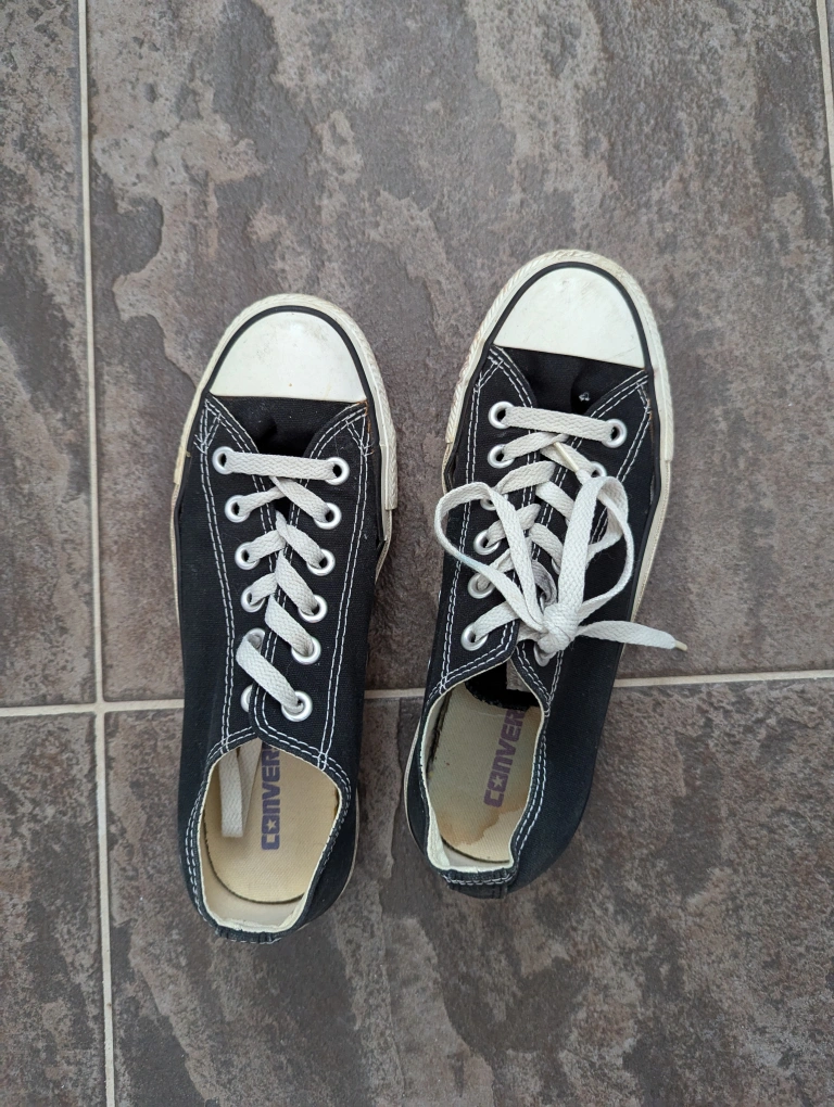 Pre-owned black Converse Chuck Taylor All Star low top sneakers. Some wear and tear visible. Great for everyday wear. ๐ญ Smoke / Pet Free Home ๐ก
