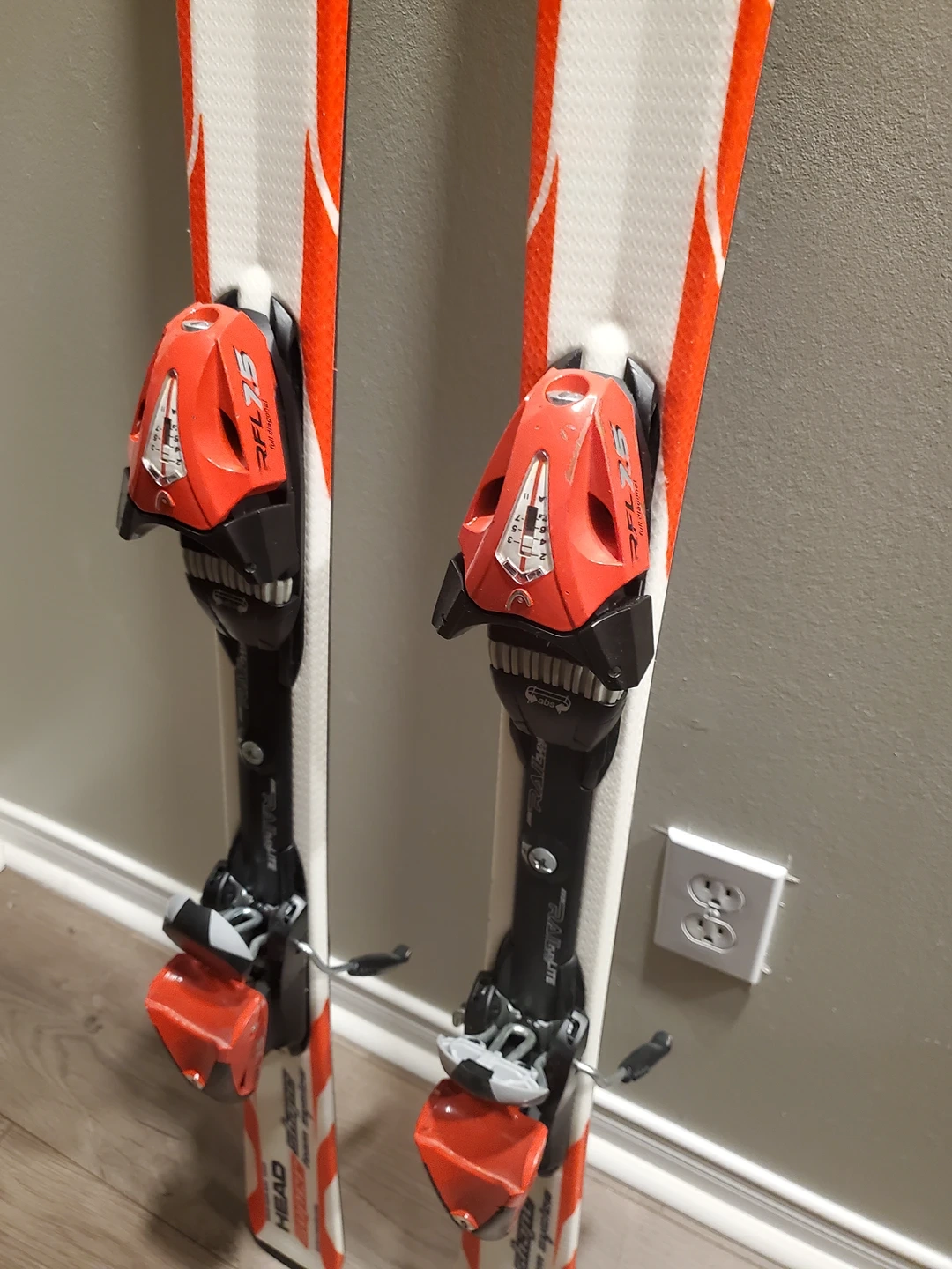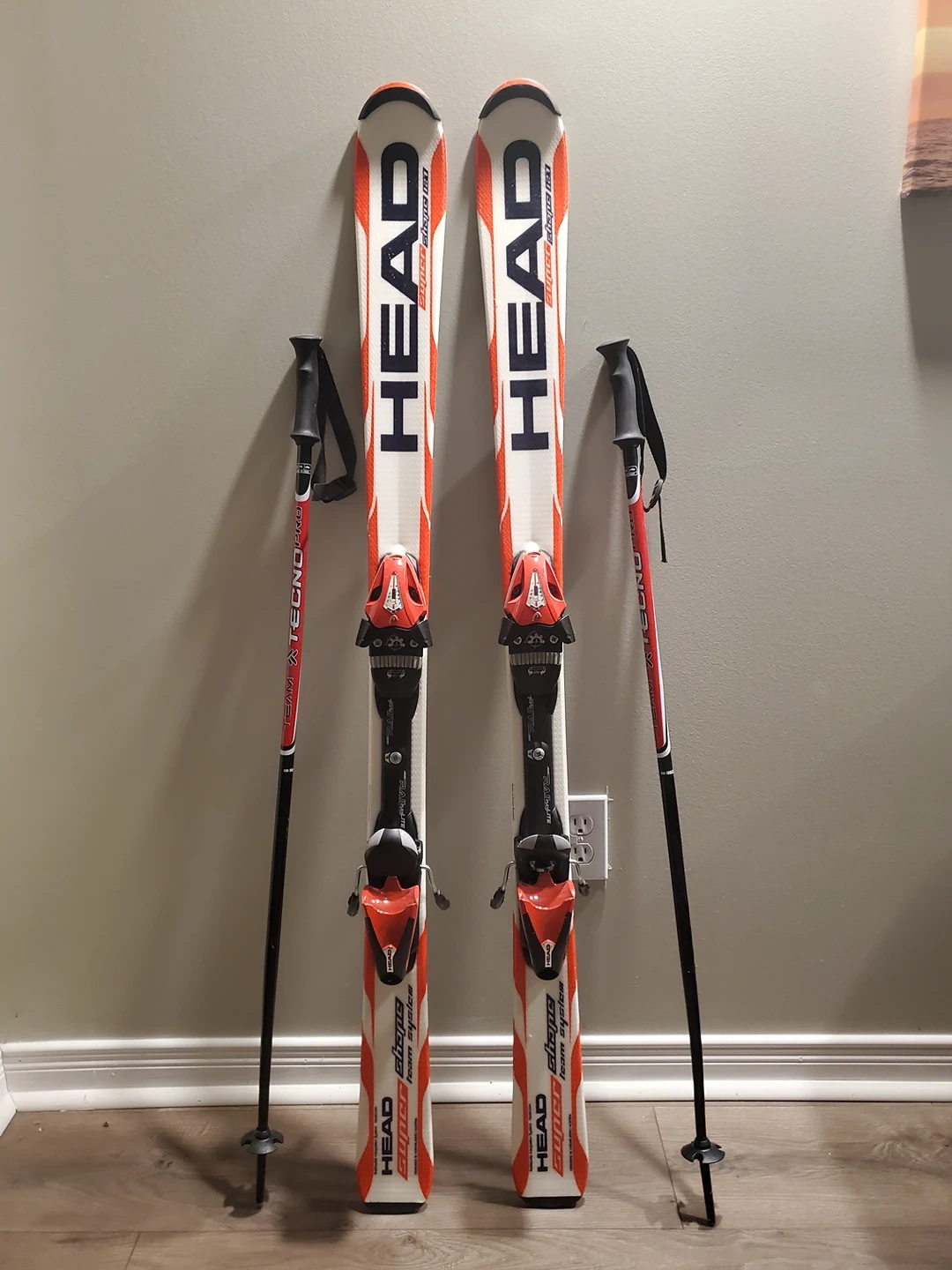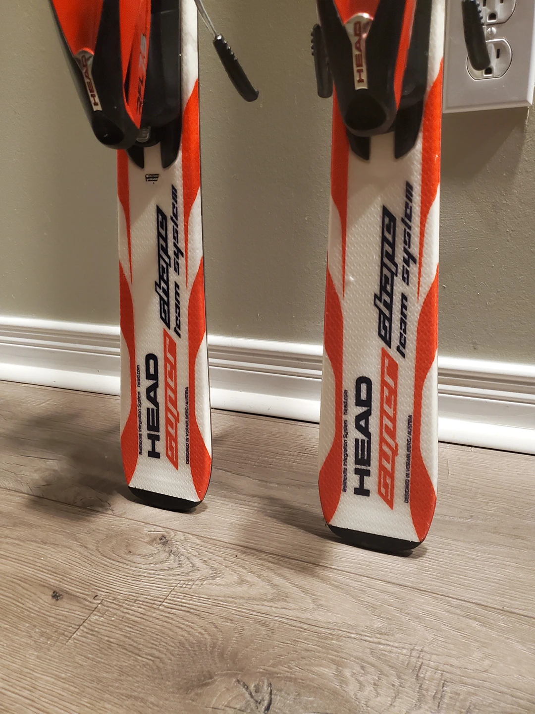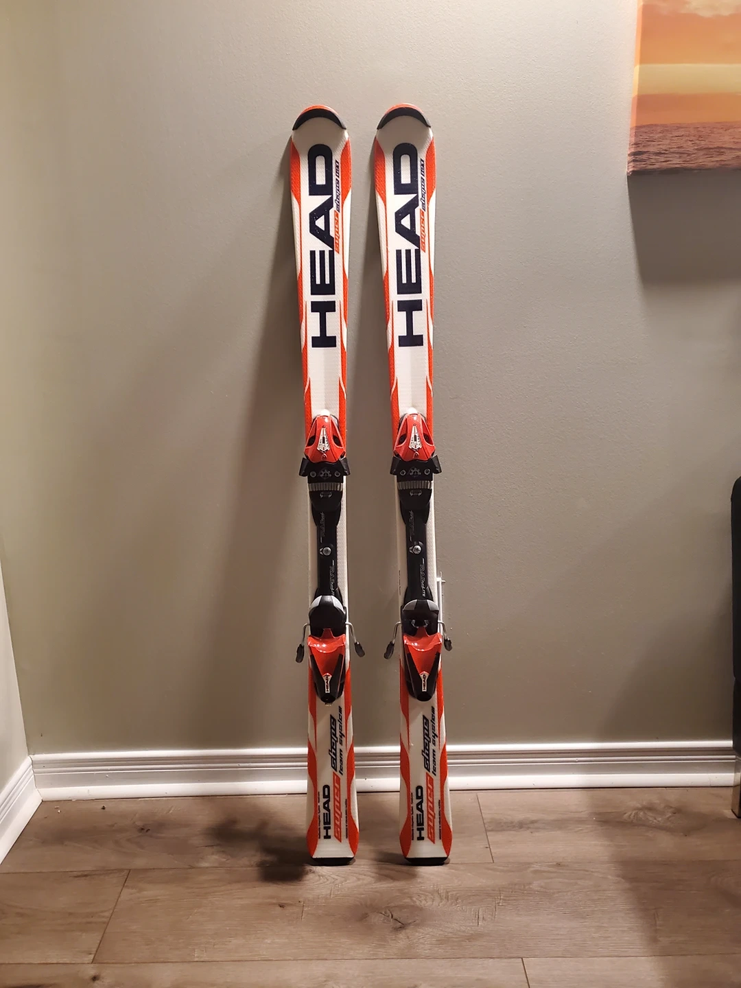 Selling a good condition pair of Head kids skis. 125cm tall. White and Red. Comes with a pair of red and white ski poles.