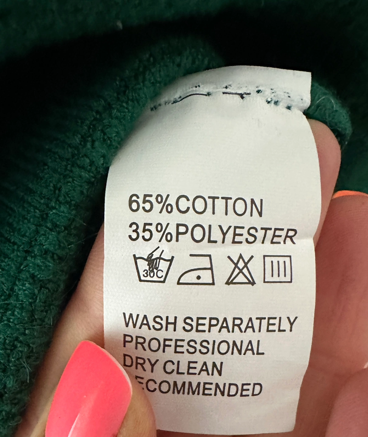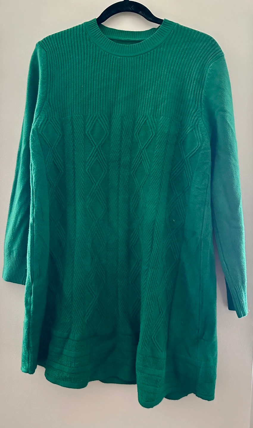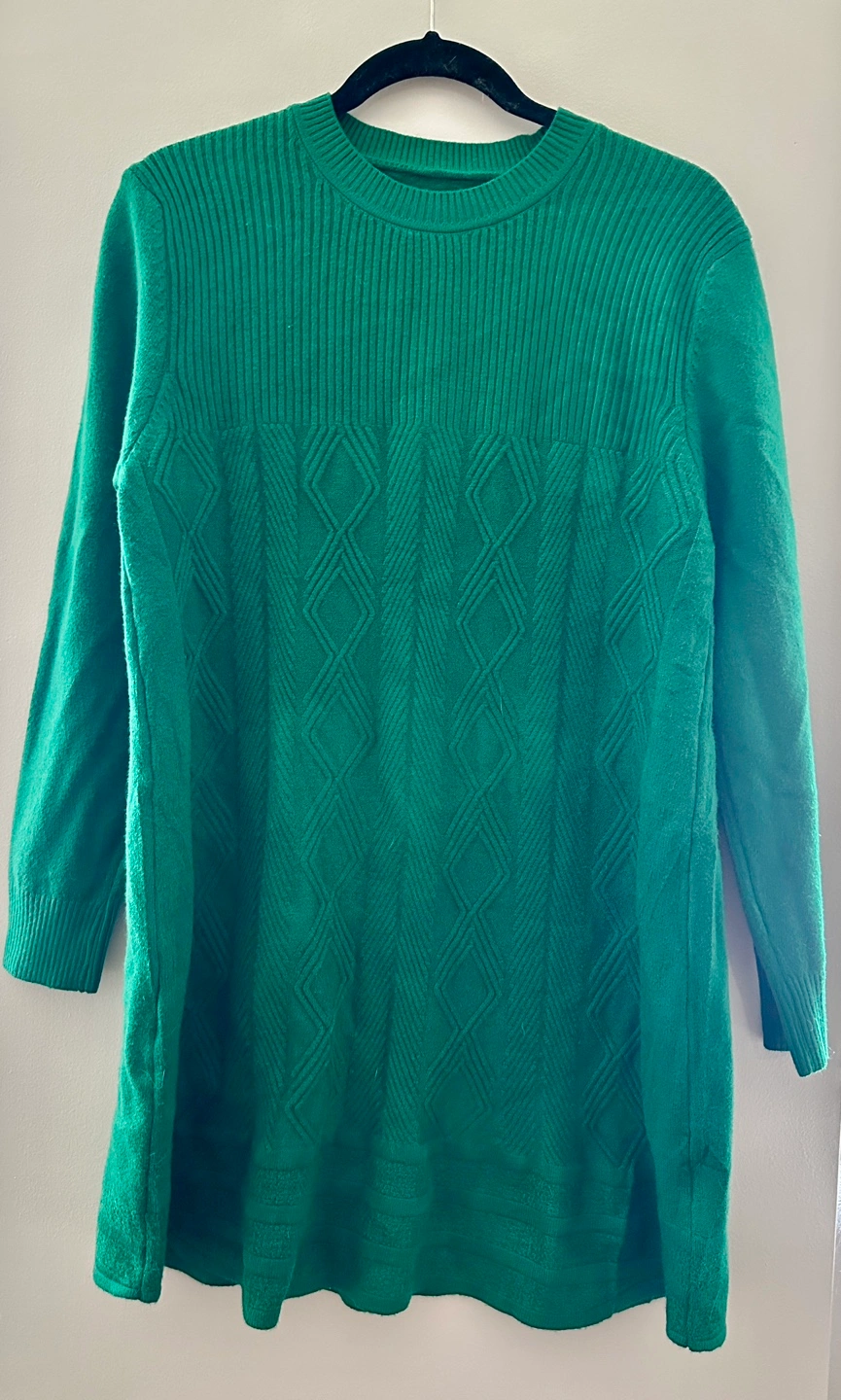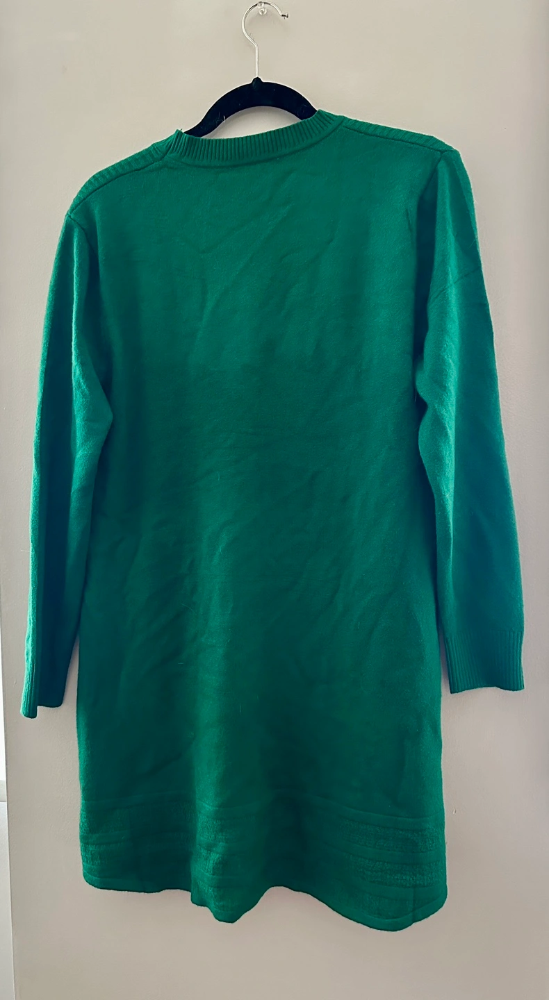 Beautiful Green sweater dress ๐ , 3/4 sleeves, cable knit pattern, relaxed fit. 65% cotton, 35% polyester. Wash separately, professional dry clean recommended.