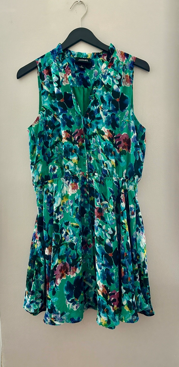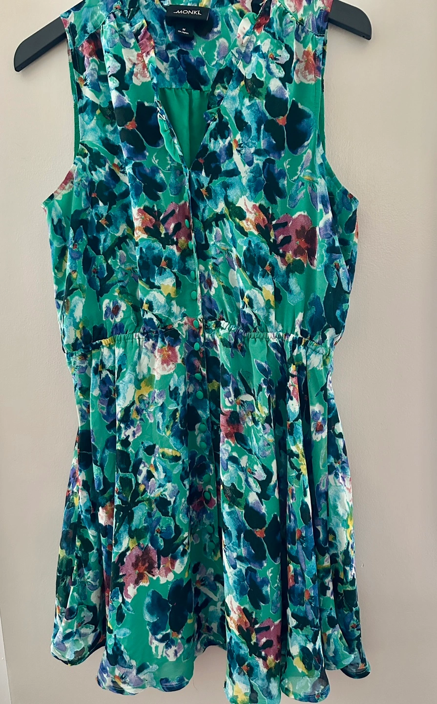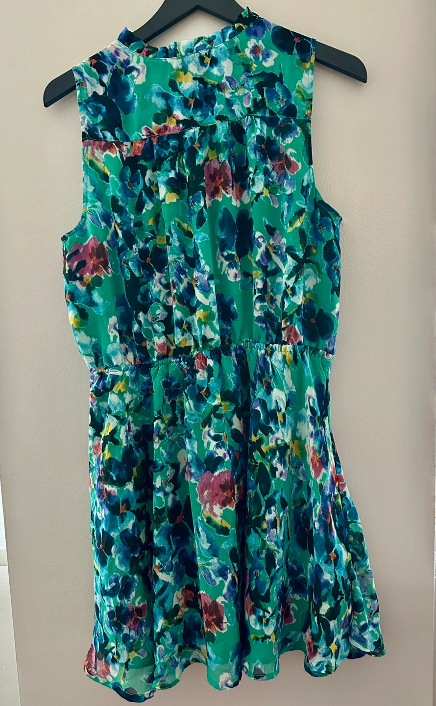 Beautiful sleeveless mini dress. Green floral print. Button closure. Size M.