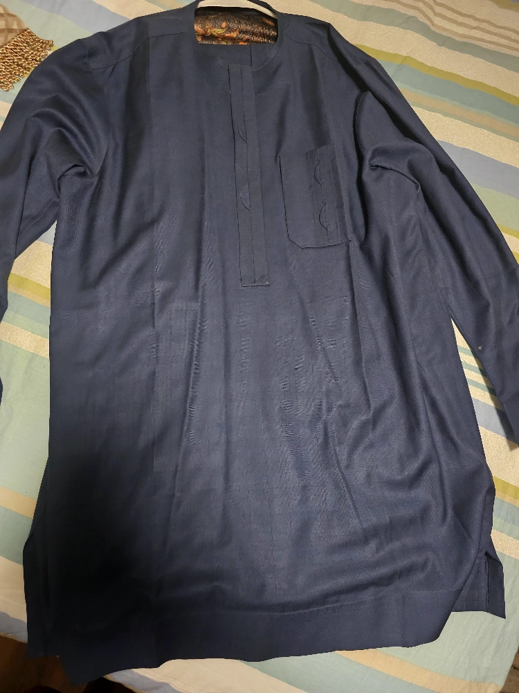 Long-sleeve navy blue men's shirt. Features a mandarin collar and a small pocket. Relaxed fit. Suitable for casual or formal wear.