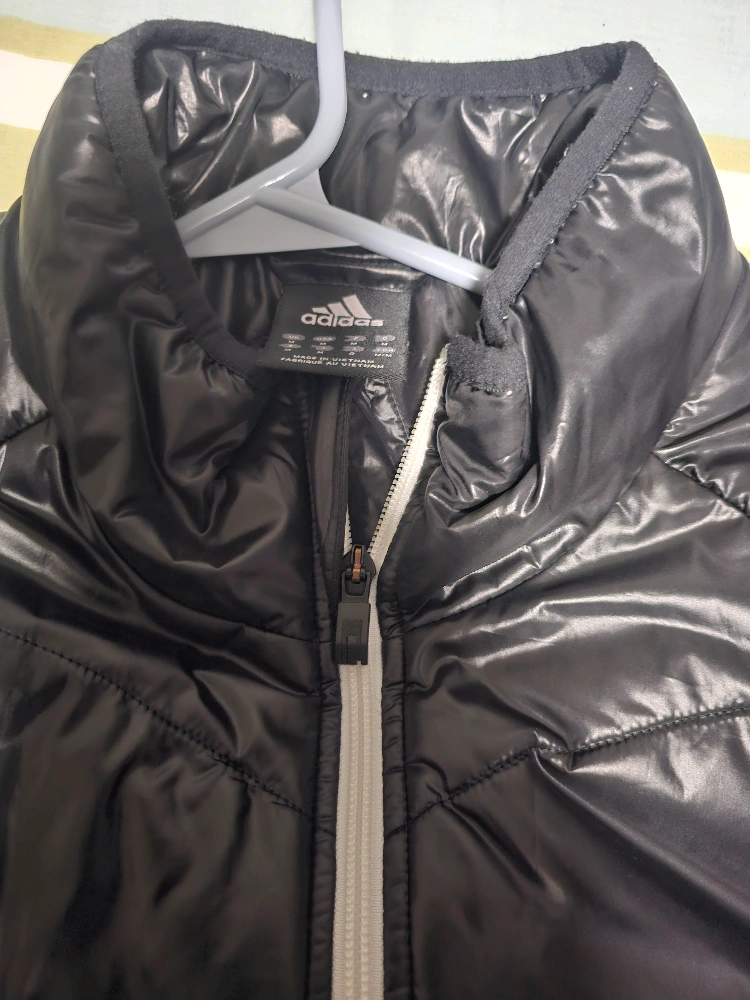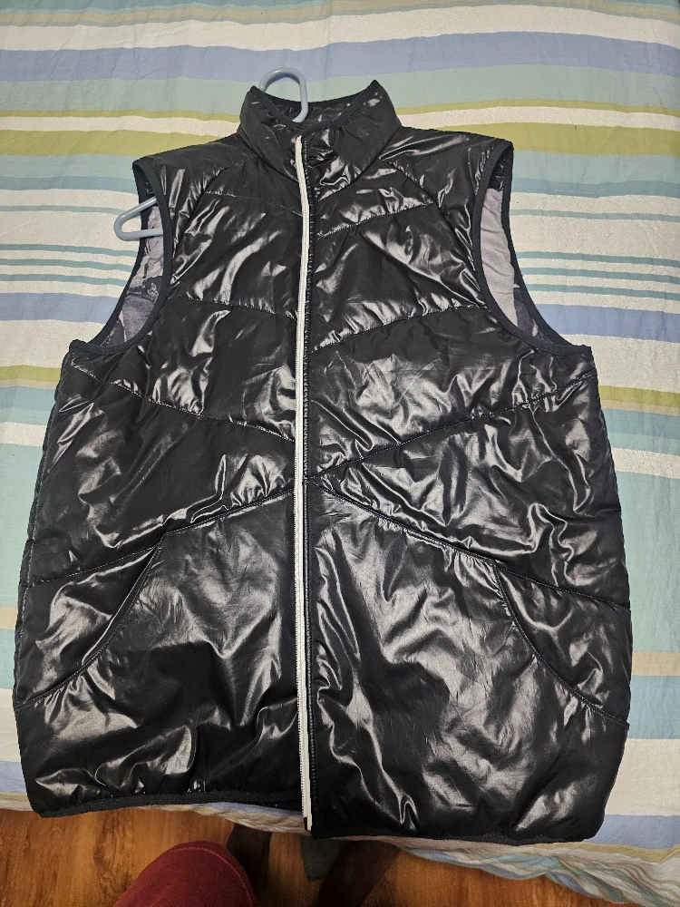 Men's black puffer vest. Zipper closure. Shiny, quilted material. Great for layering.