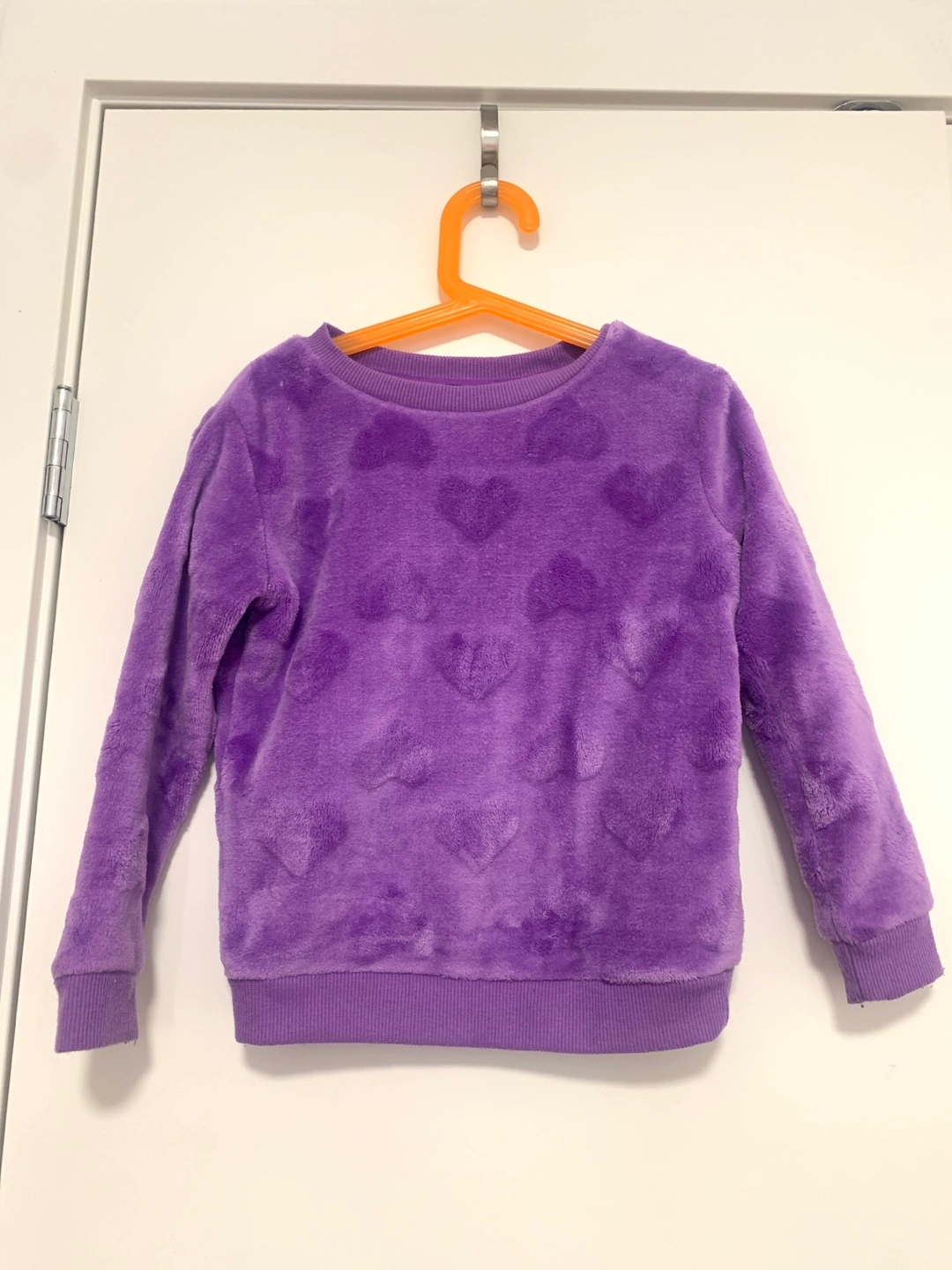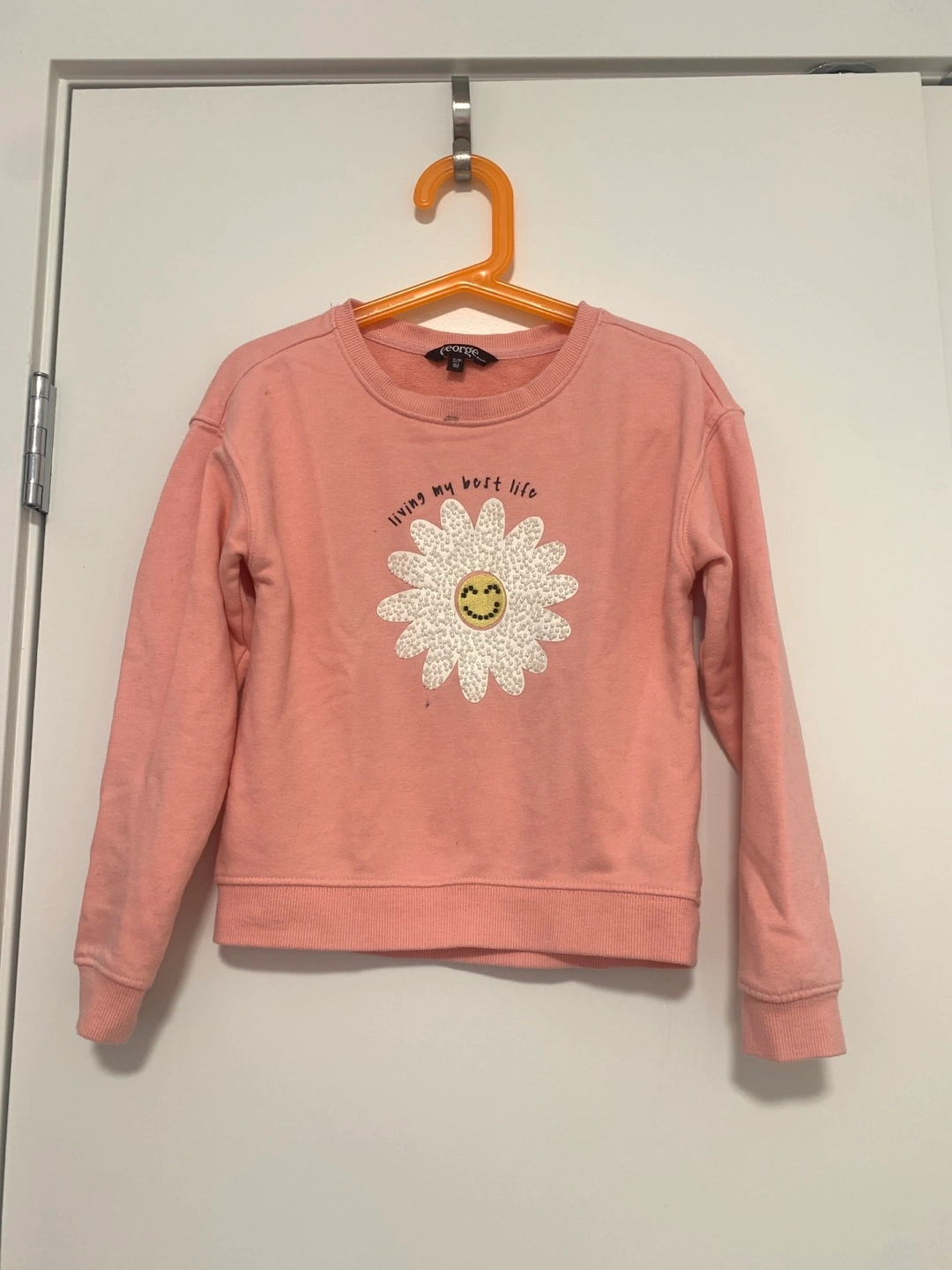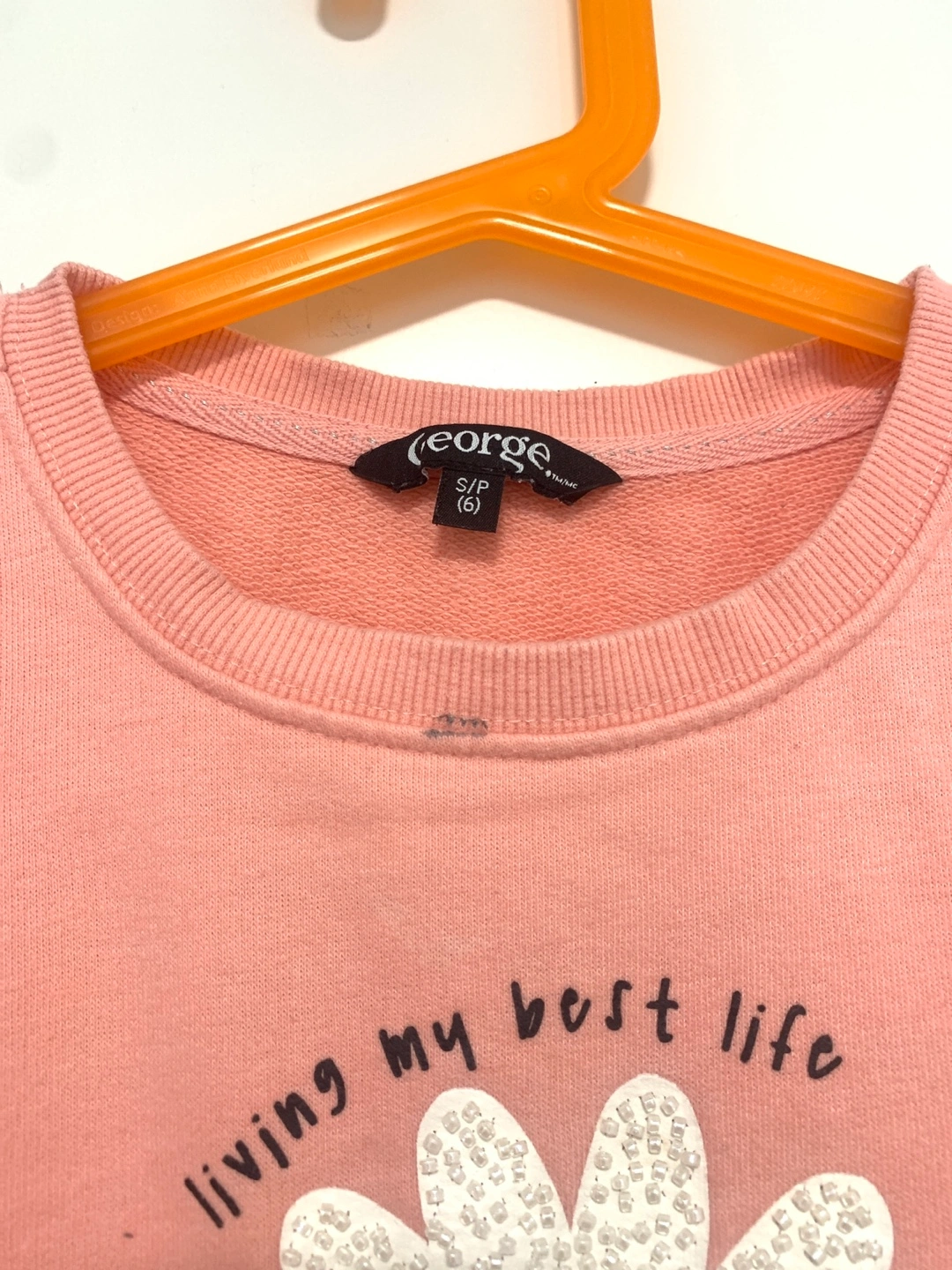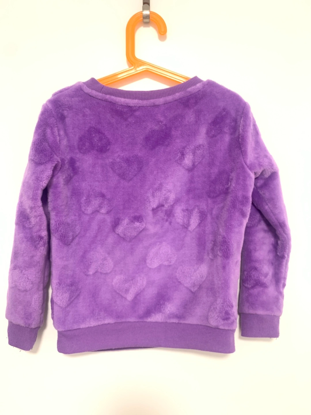 Two girls' sweatshirts, size 6. One purple with heart pattern, other pink with flower and 'living my best life' text. Long sleeves, crew necks. 8$ each or take both for 12$