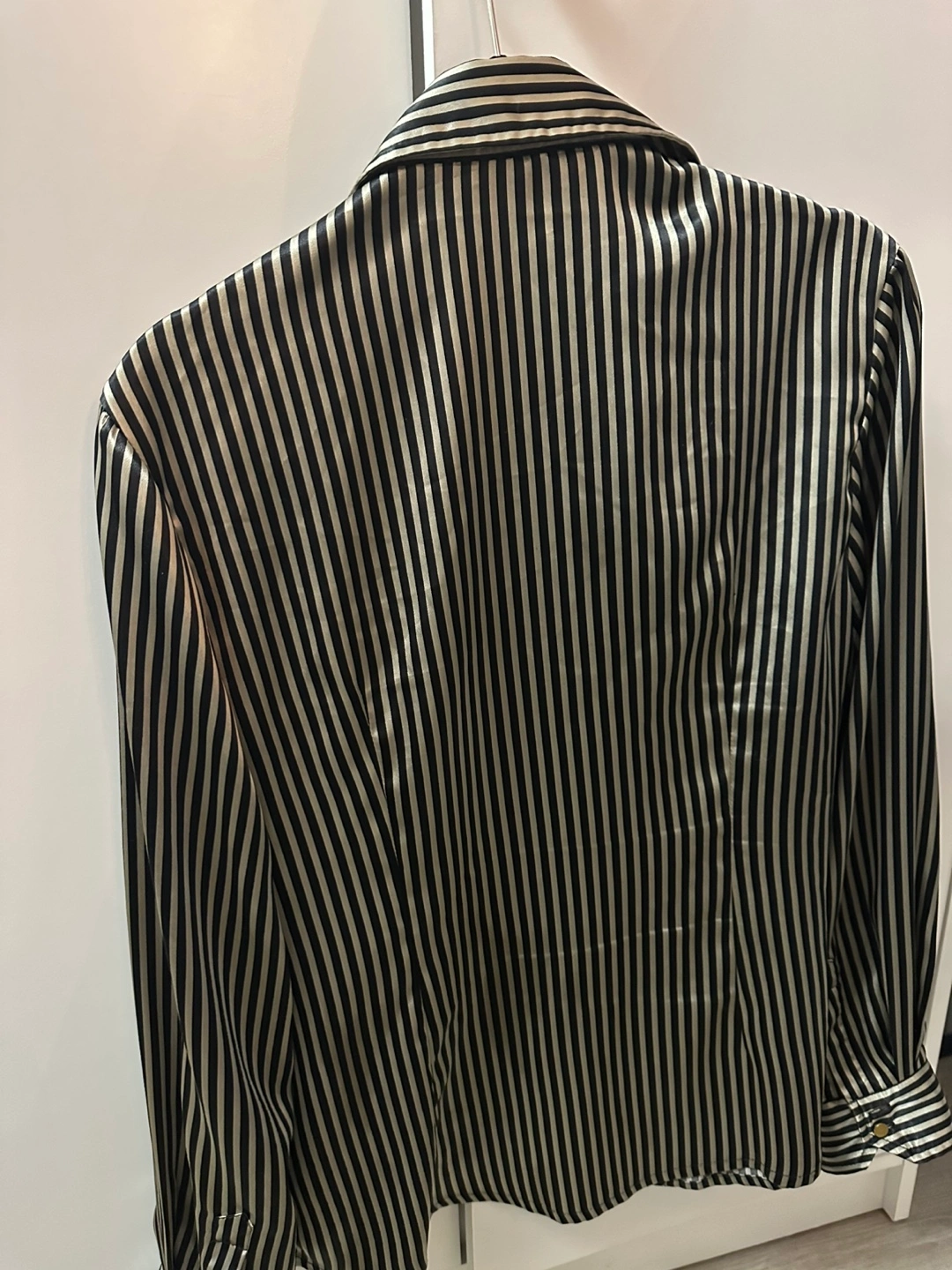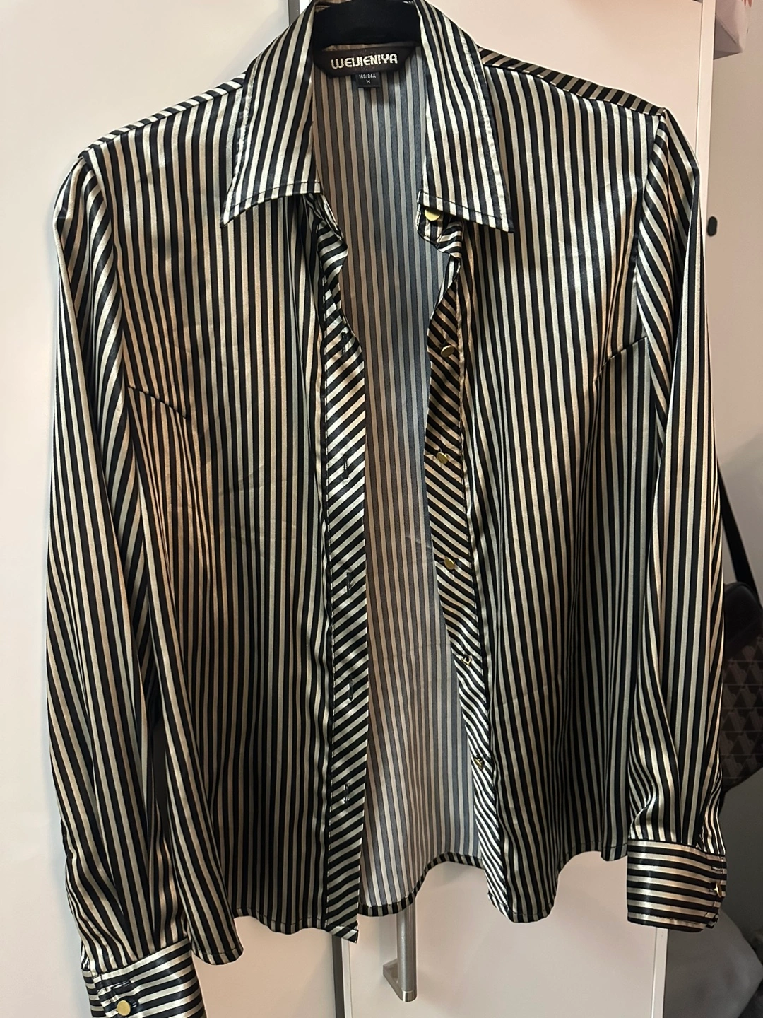 Long-sleeved button-up shirt. Black and gold vertical stripes. Satin material. Looks great with jeans or a skirt.