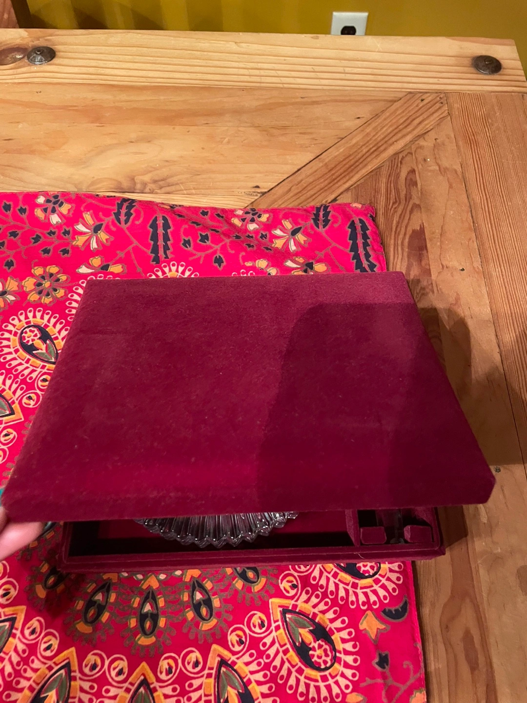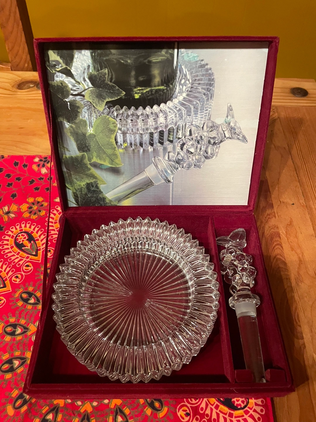 Stunning crystal wine decanter and matching plate. Beautiful design, perfect for entertaining or a special gift. Comes in original burgundy velvet-lined box. Excellent condition.