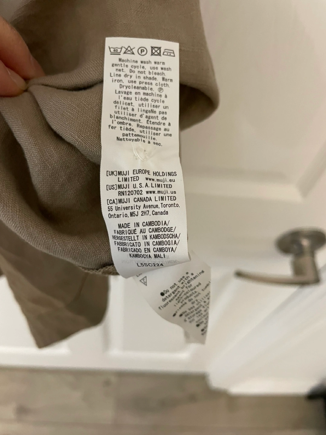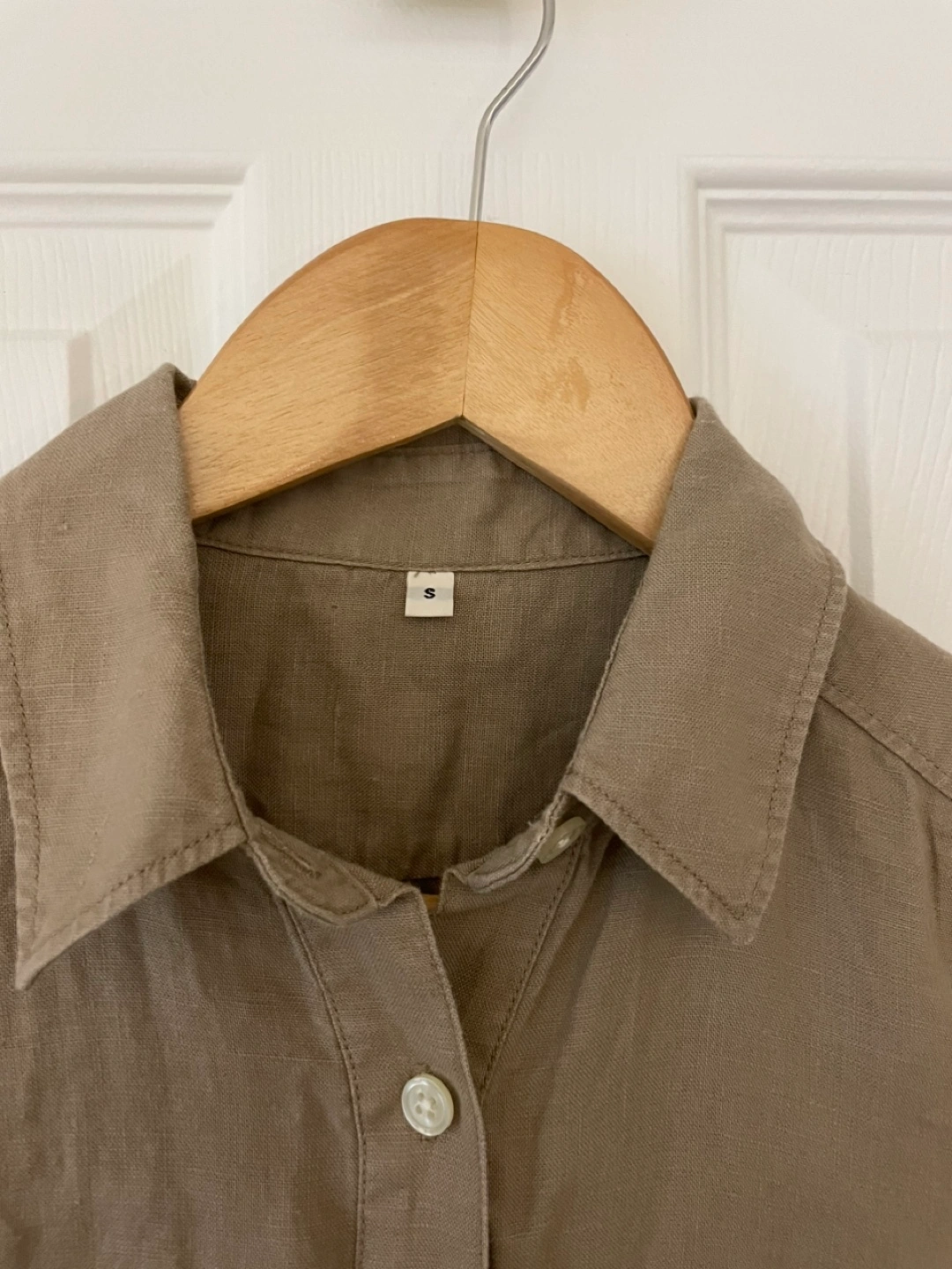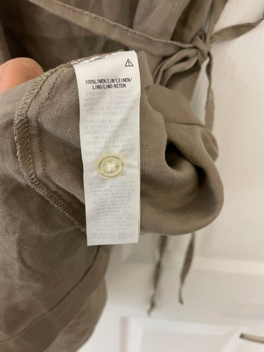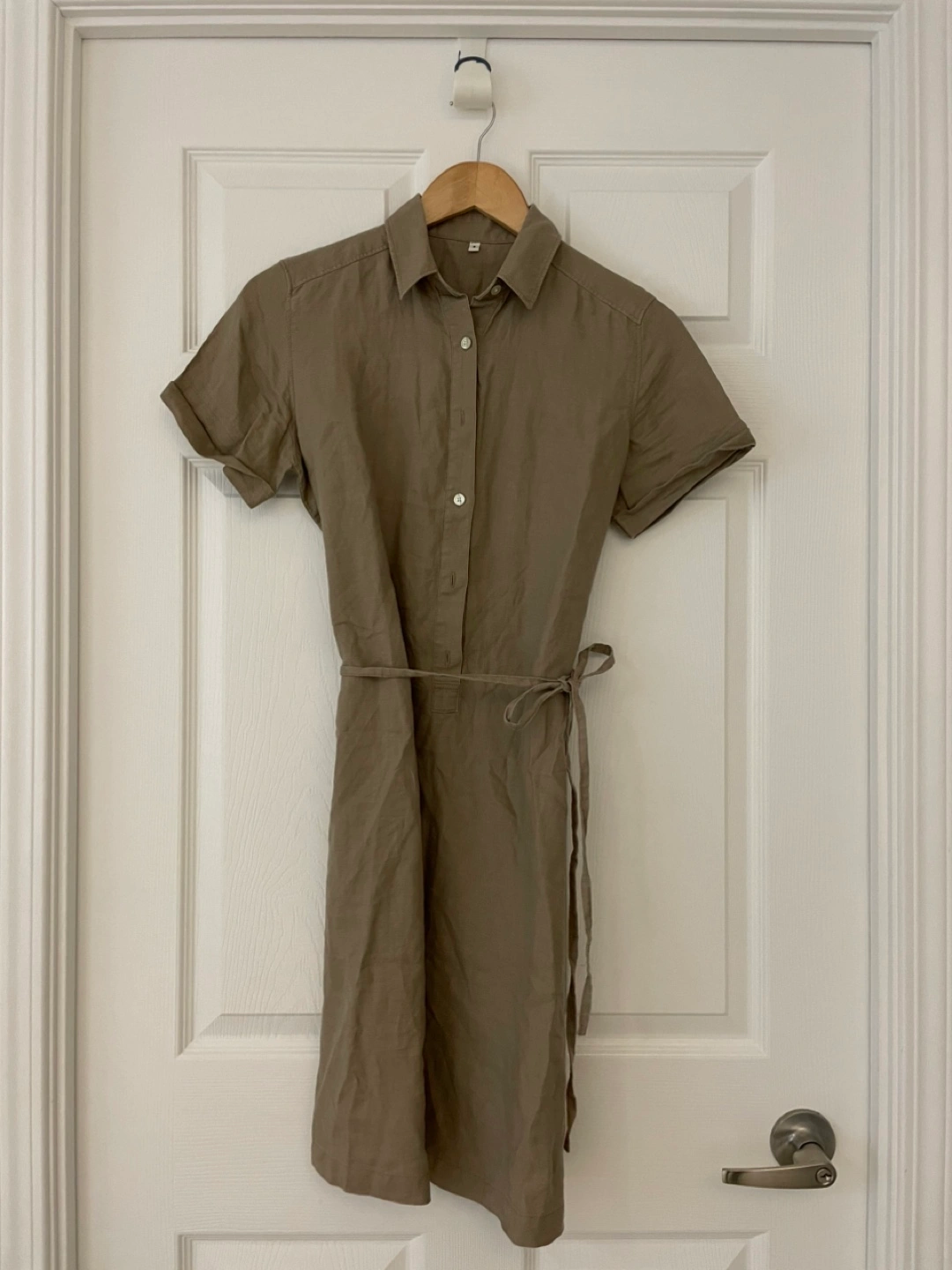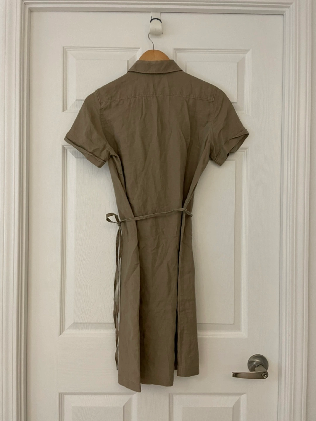 Taupe linen wrap dress. 100% linen. Short sleeves. Self-tie belt. Made in Cambodia.
