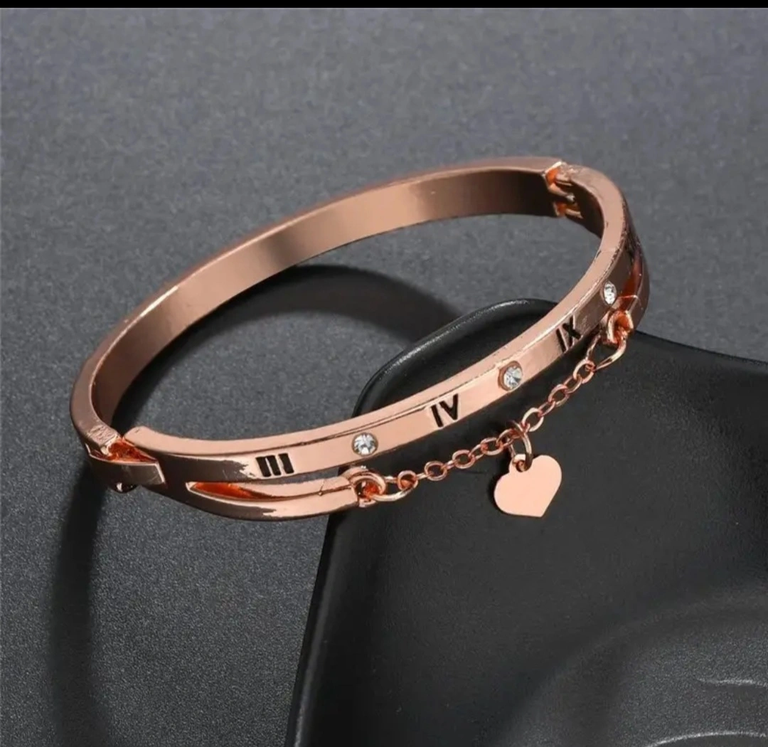 Elegant rose gold bangle bracelet. Features Roman numerals and clear cubic zirconia accents. Delicate chain with a small heart charm. Stylish and fashionable accessory. Smoke free and pet free home Kindly note all sales are final and no return or refund Please check my other listings aswell😊