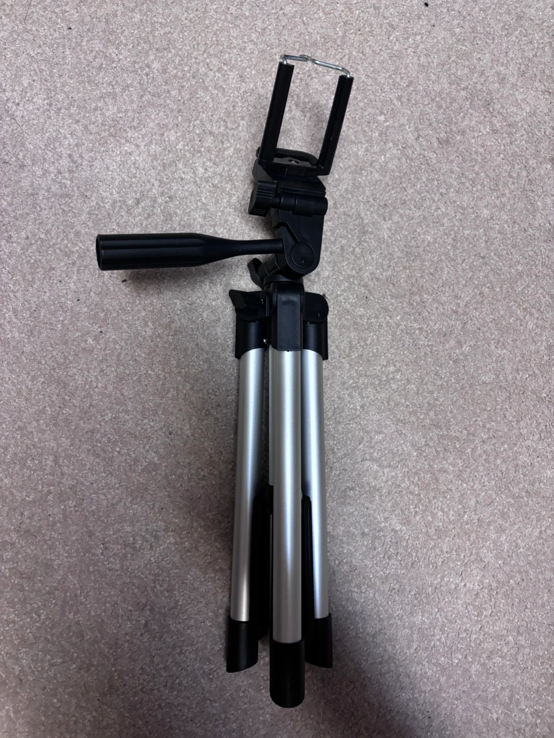 Portable tripod stand, adjustable height. Phone holder included. Great for photos and videos.