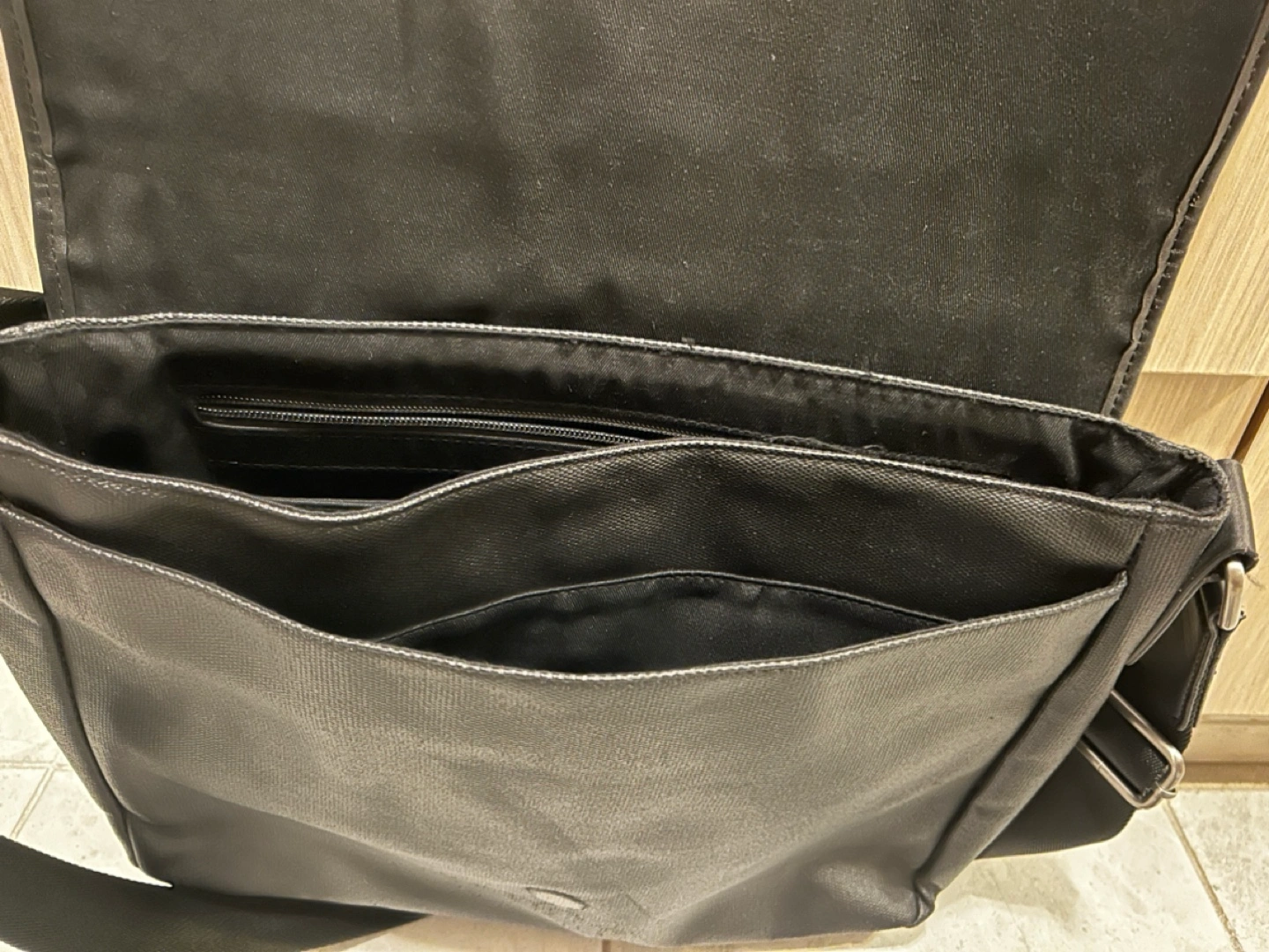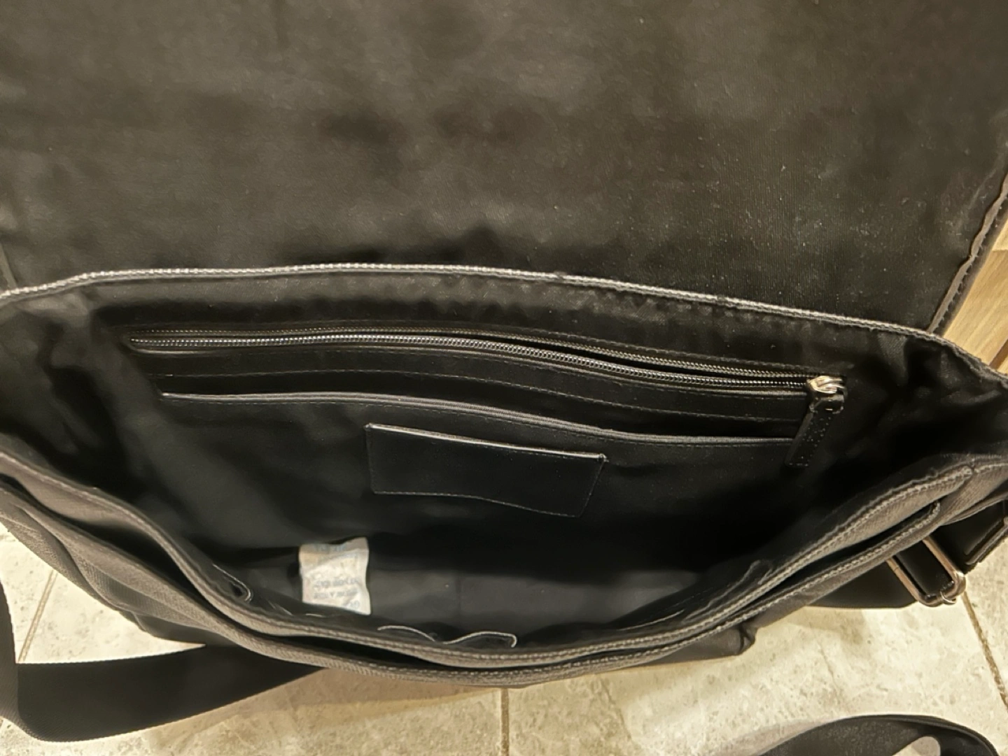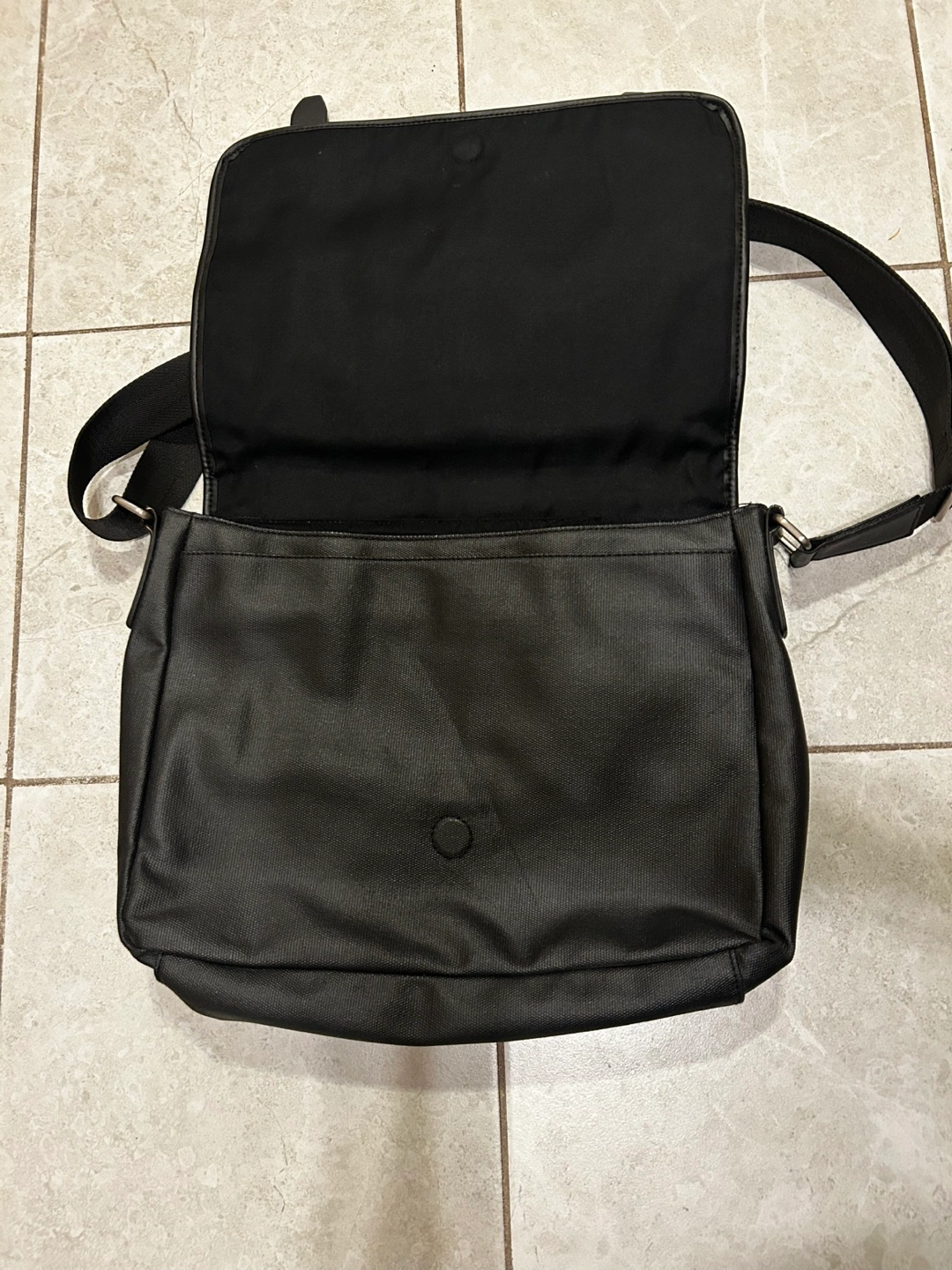 Black messenger bag. Adjustable shoulder strap. Multiple compartments. Great for everyday use. Great for a large laptop. Pick up only