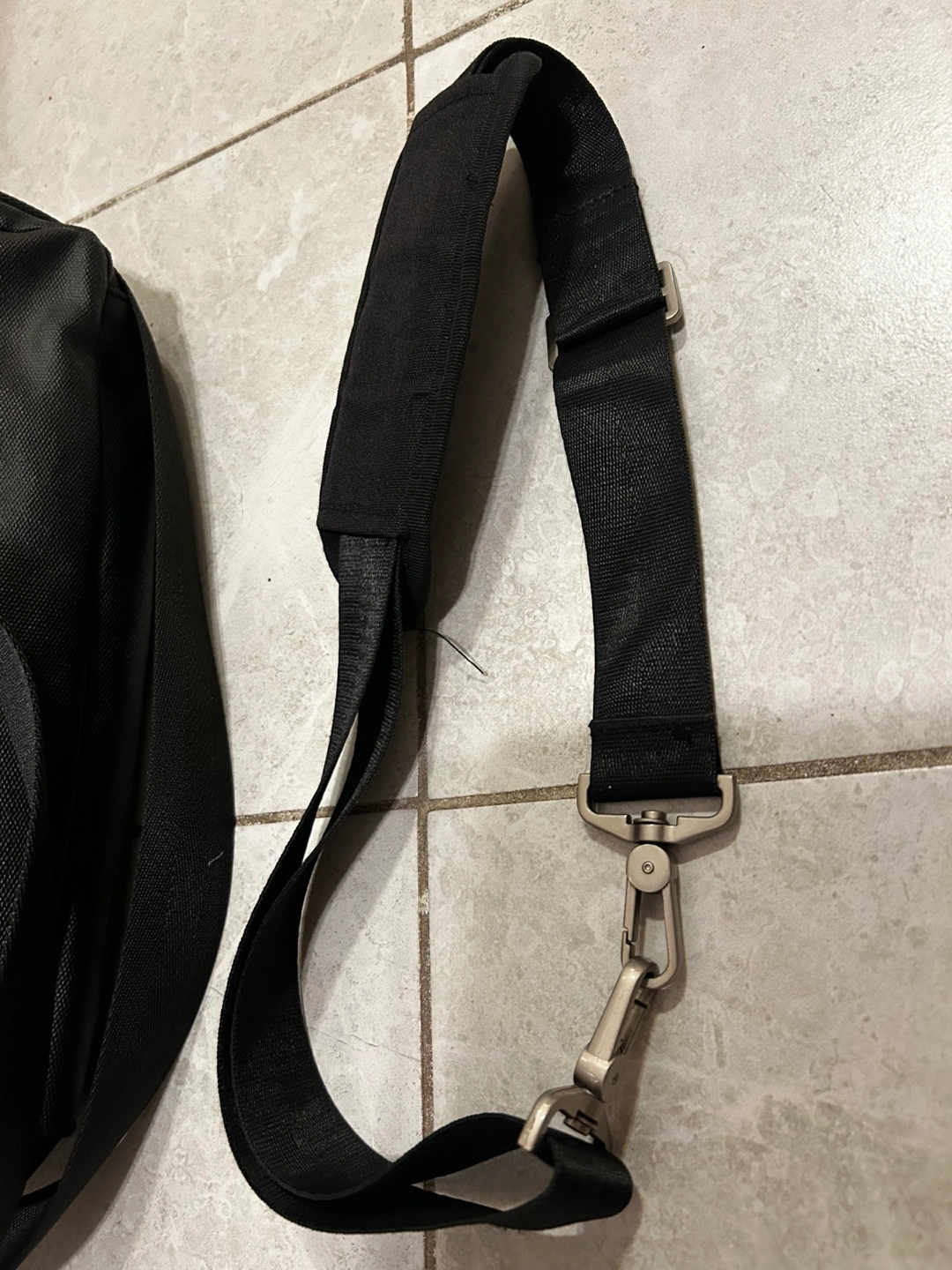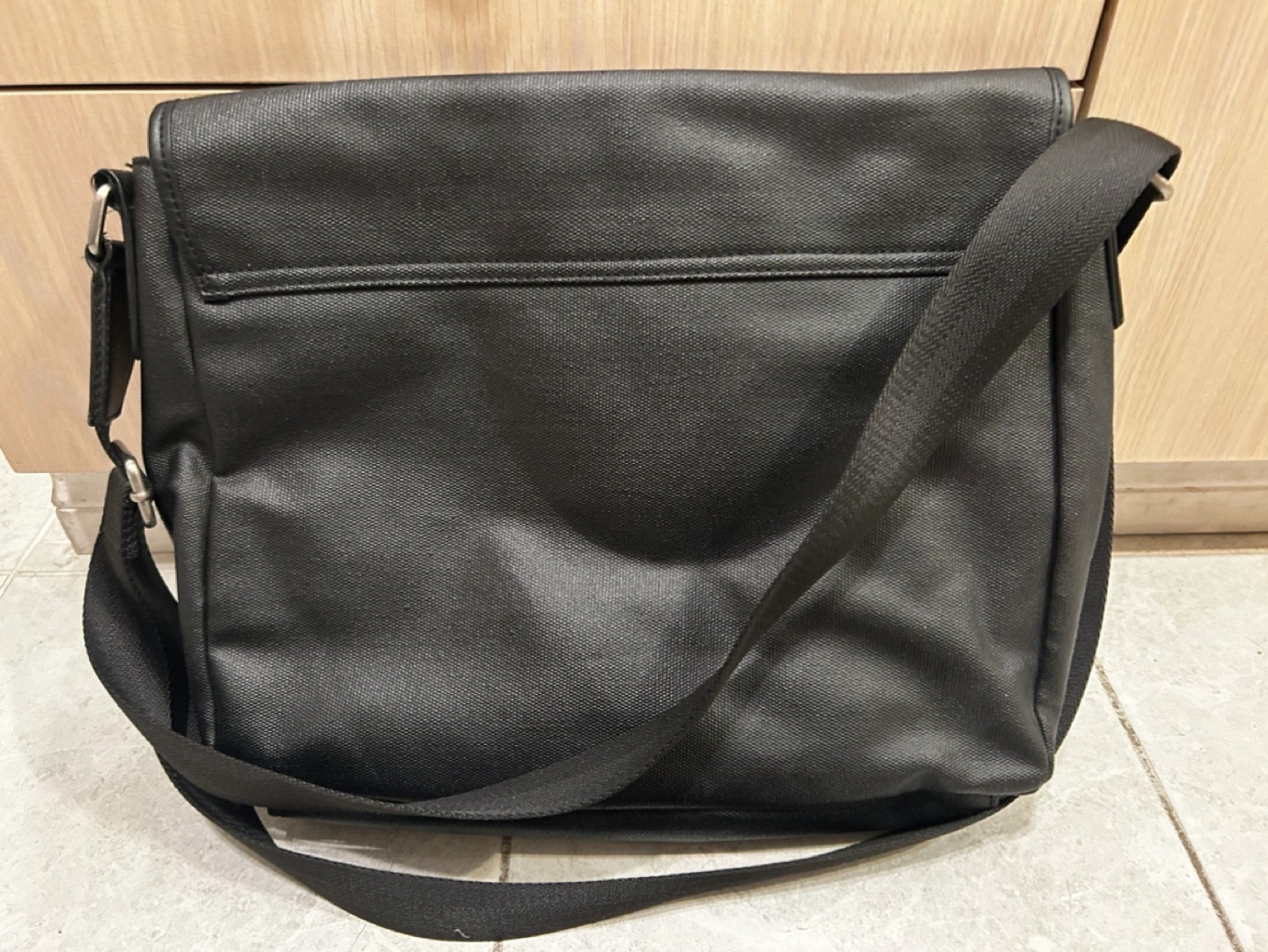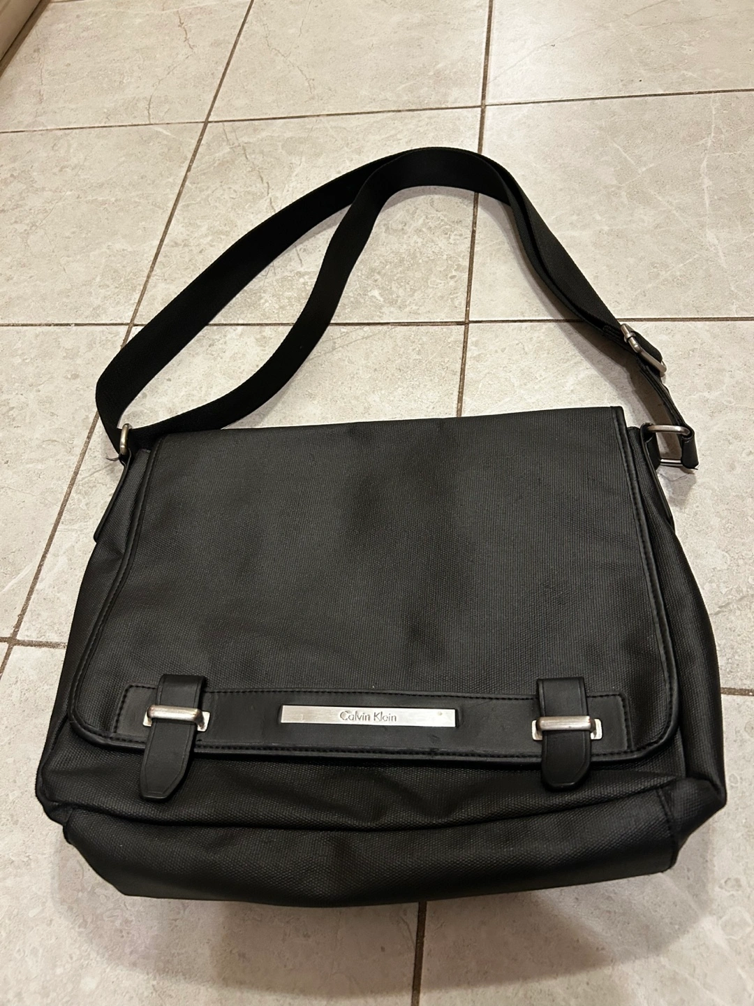 Black messenger bag. Adjustable shoulder strap. Multiple compartments. Great for everyday use. Great for a large laptop. Pick up only