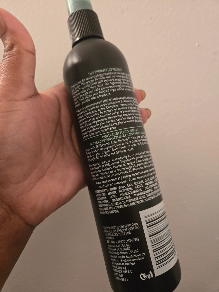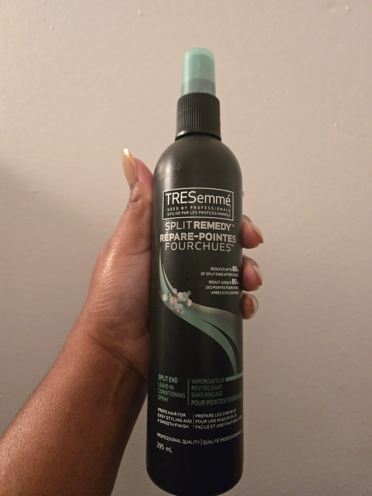 bottle of TRESemmé Split Remedy leave-in conditioning spray. Preps hair for styling, easy styling and smooth finish. Reduces up to 80% of split ends after use✨️😌 USED... CURBSIDE PICK UP ONLY..✨️👋🏾
