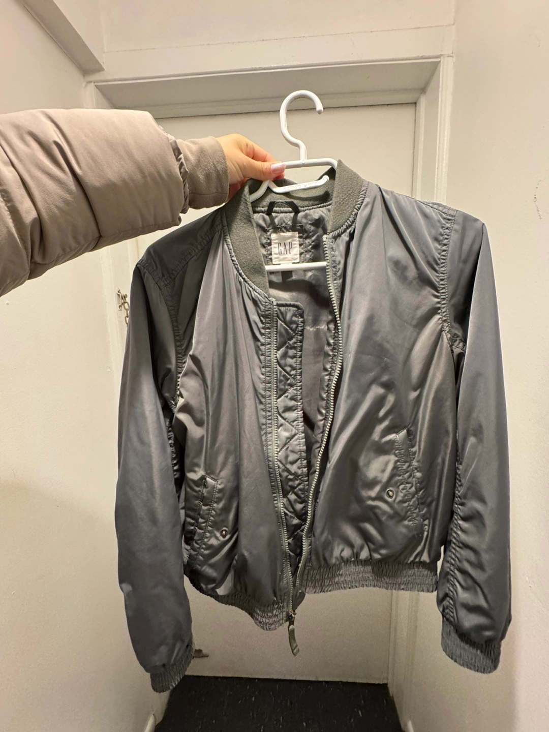 Grey bomber jacket. Zipper closure. Ribbed cuffs and hem. Great for layering. No rips Like new