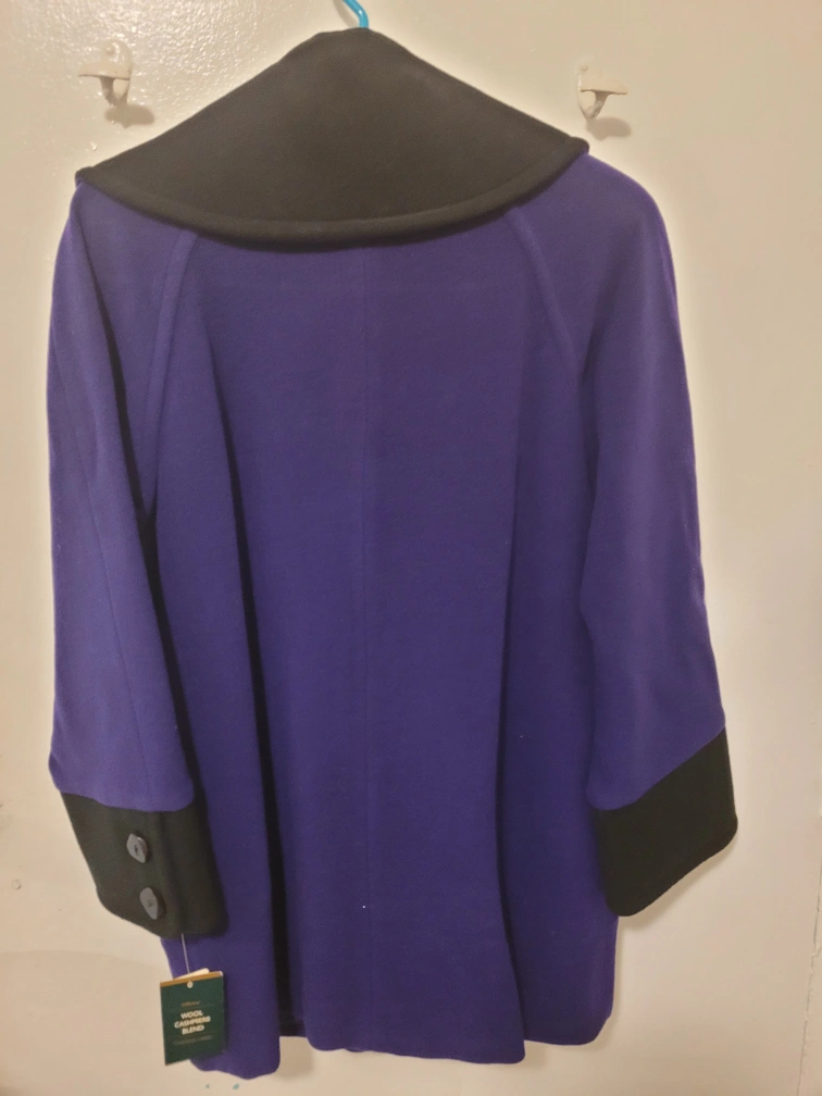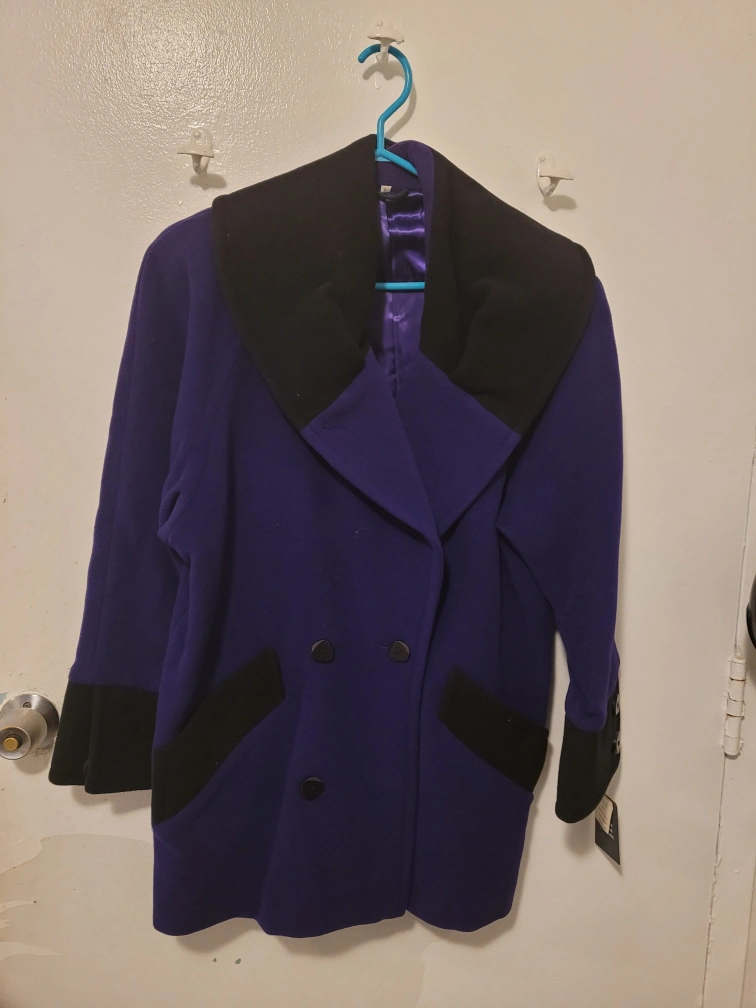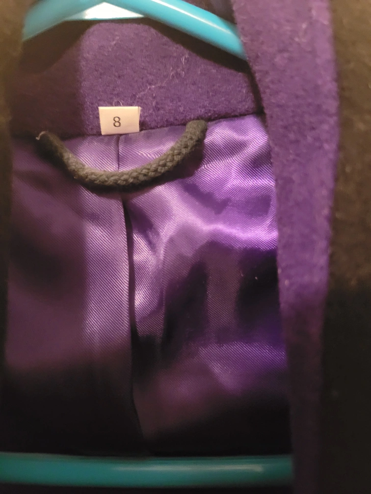 Gorgeous purple wool blend coat. Double breasted, features a contrasting black collar and cuffs. Size 8. Excellent condition.