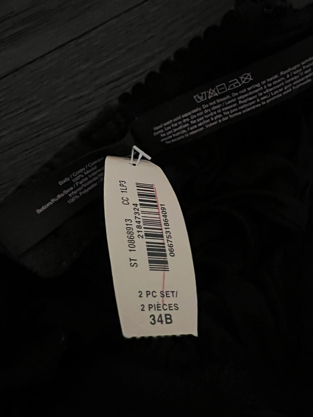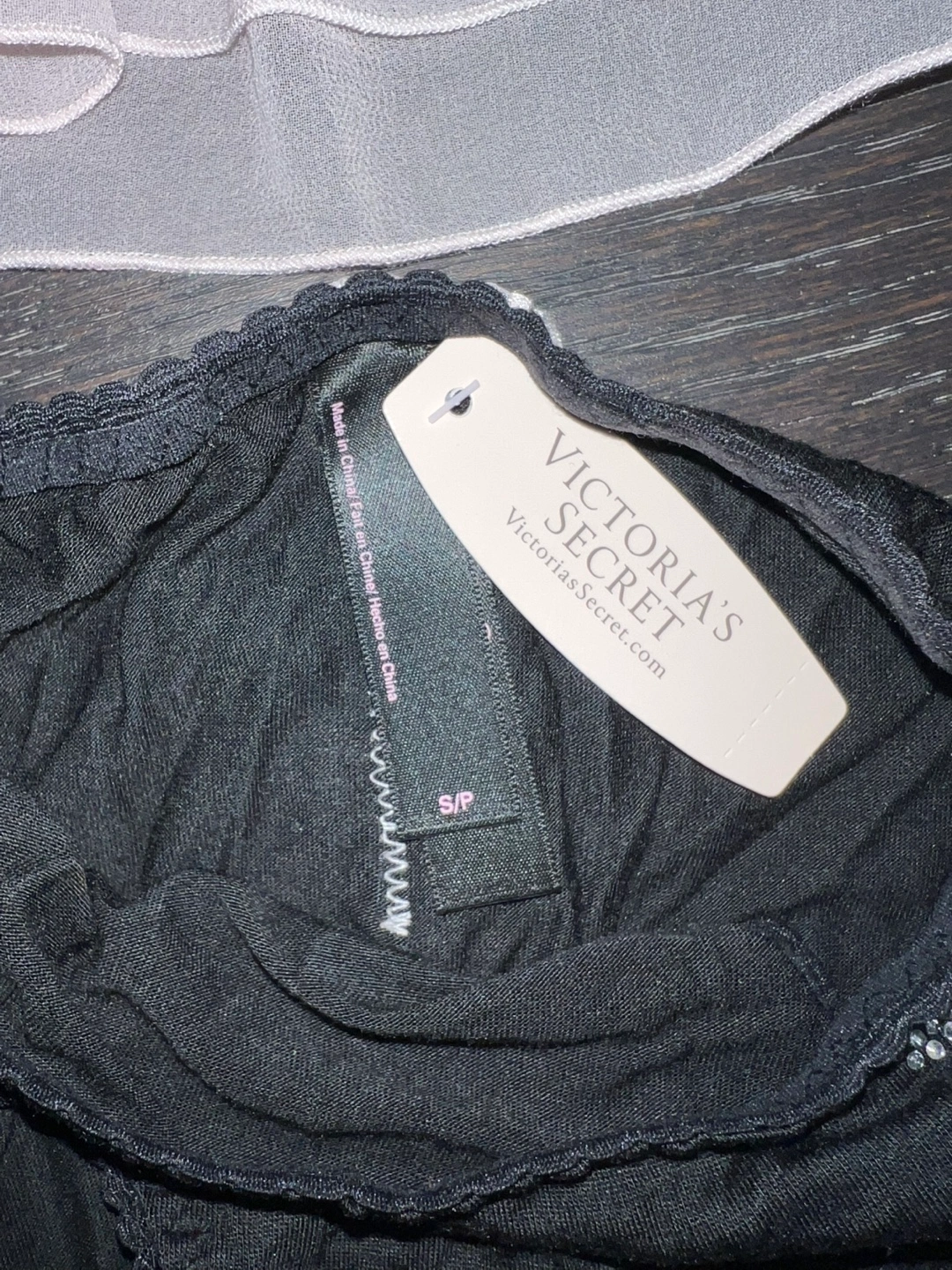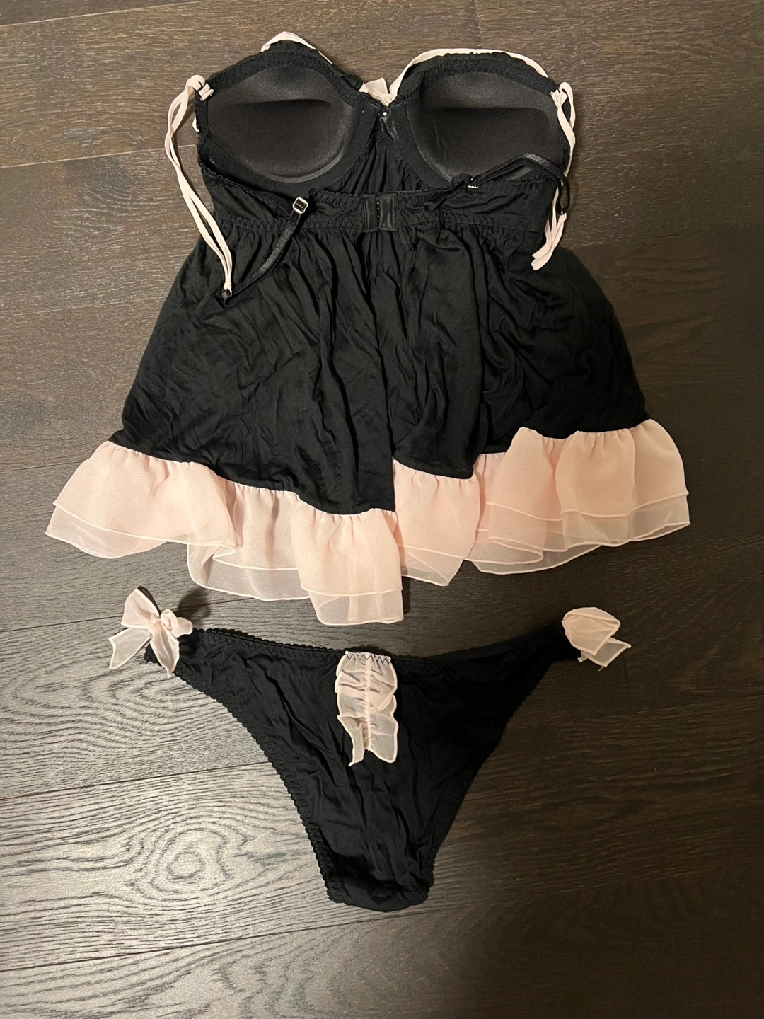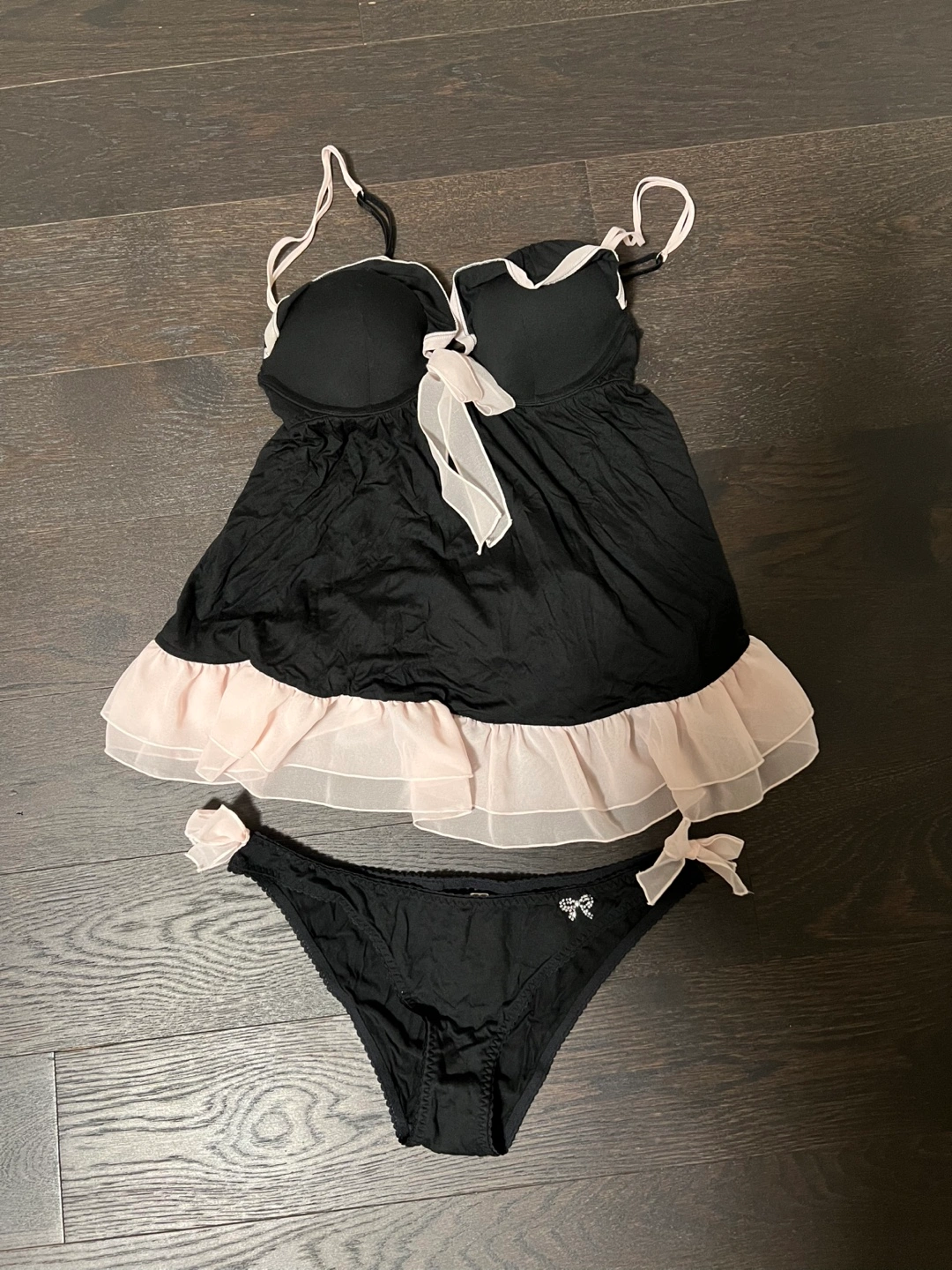 Black and blush lingerie set. Includes chemise and panty with delicate ruffles and bows. Top/bra is size 34B, underwear size small. Brand new with still tags.