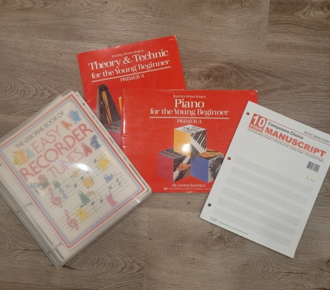 Three Bastien Piano Basics books: Piano Primer A and Theory & Technic Primer A. Also included: The Usborne Book of Easy Recorder Tunes and 10 stave manuscript paper.