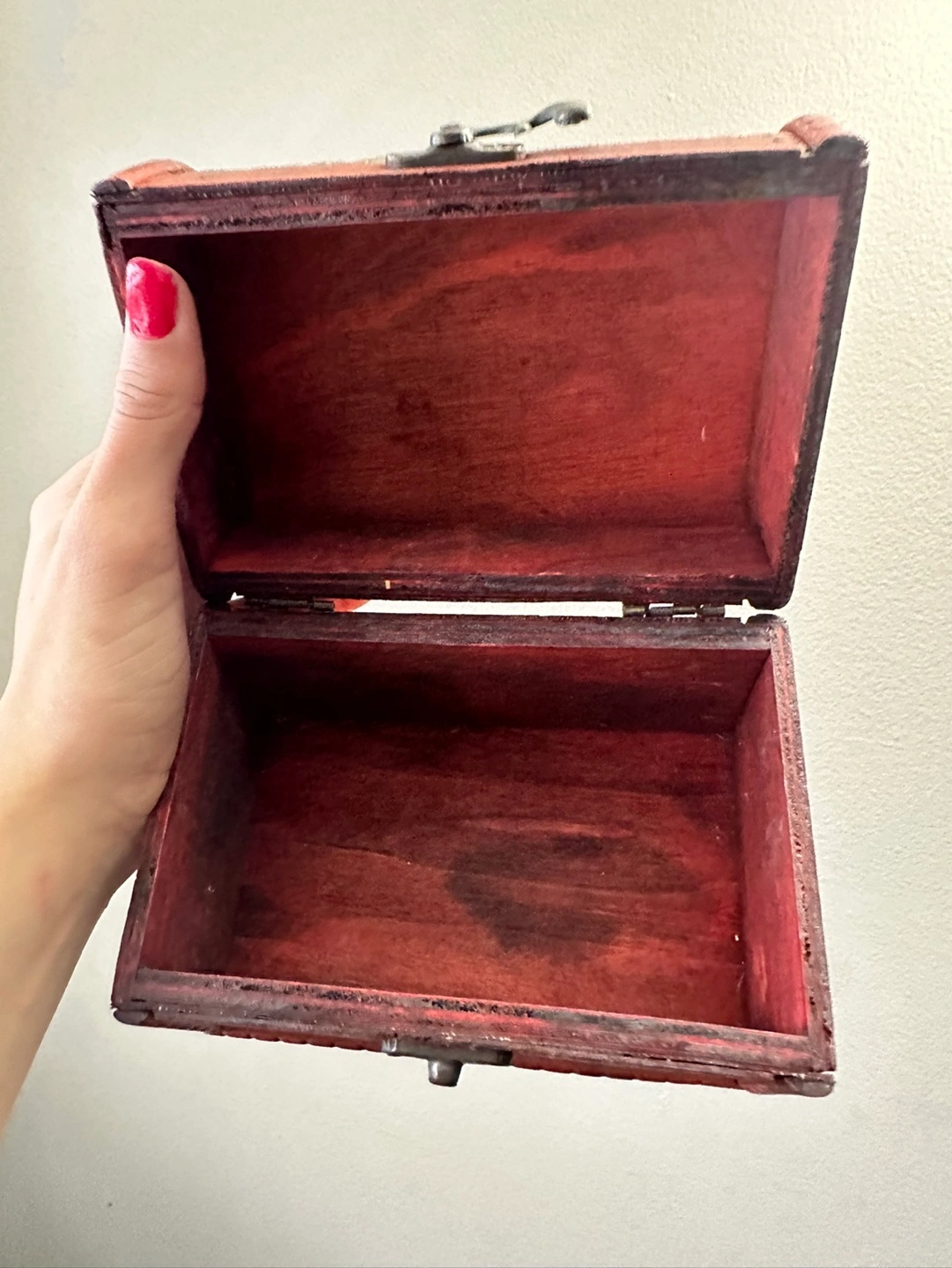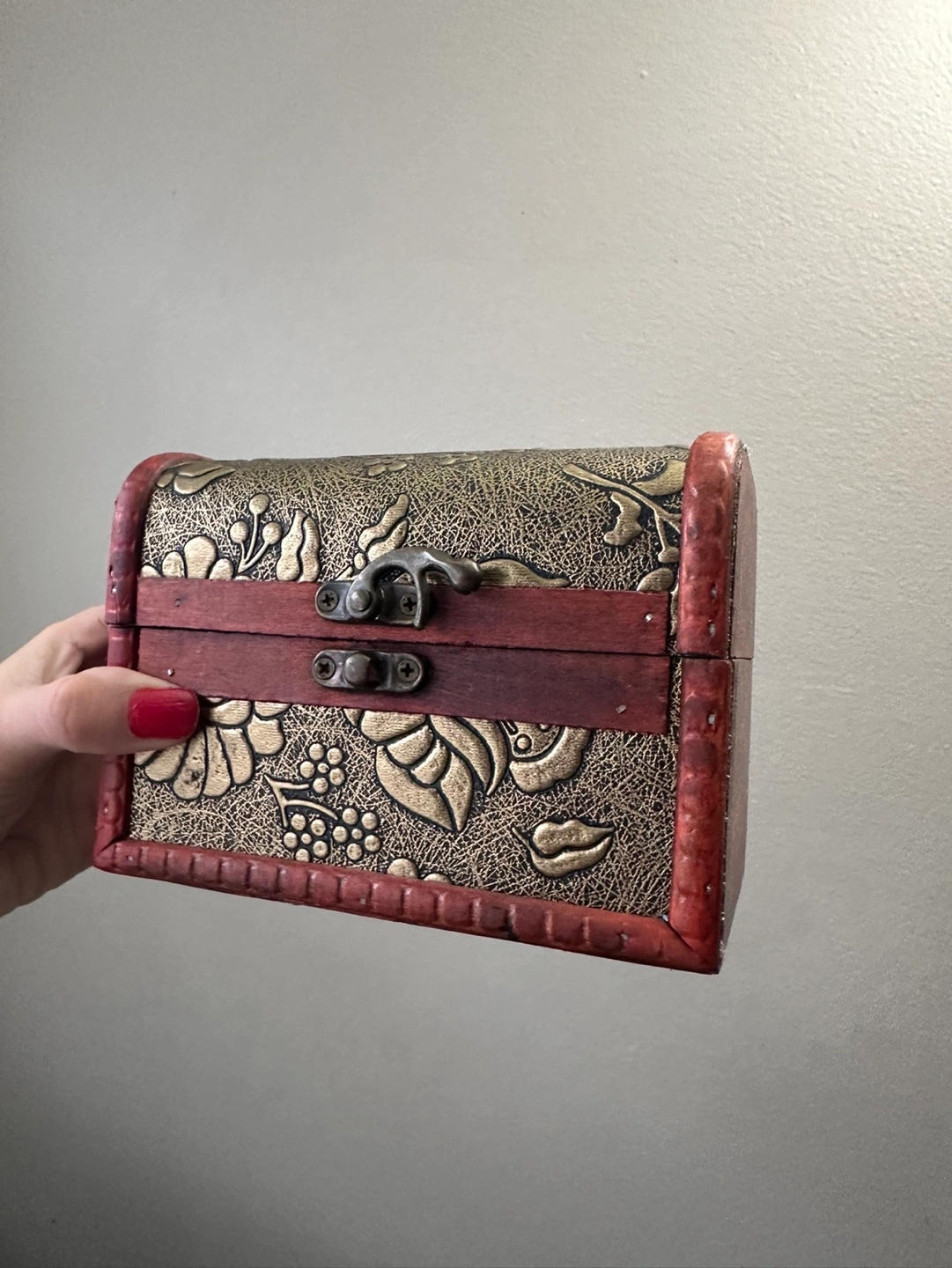 Small decorative wooden chest. Features a gold floral design. Red wood interior. Perfect for jewellery or other small items. Has a clasp closure.