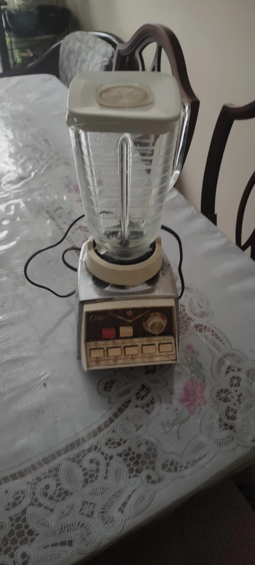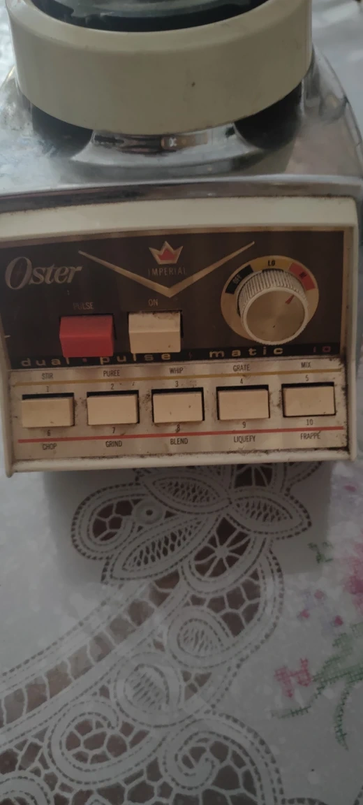Vintage Oster Imperial Dual-Matic 10 blender. Glass jar, multiple speed settings. Shows signs of age and use. Cord included. ( leaking from the crack plastic base of the jug) can be replaced.
