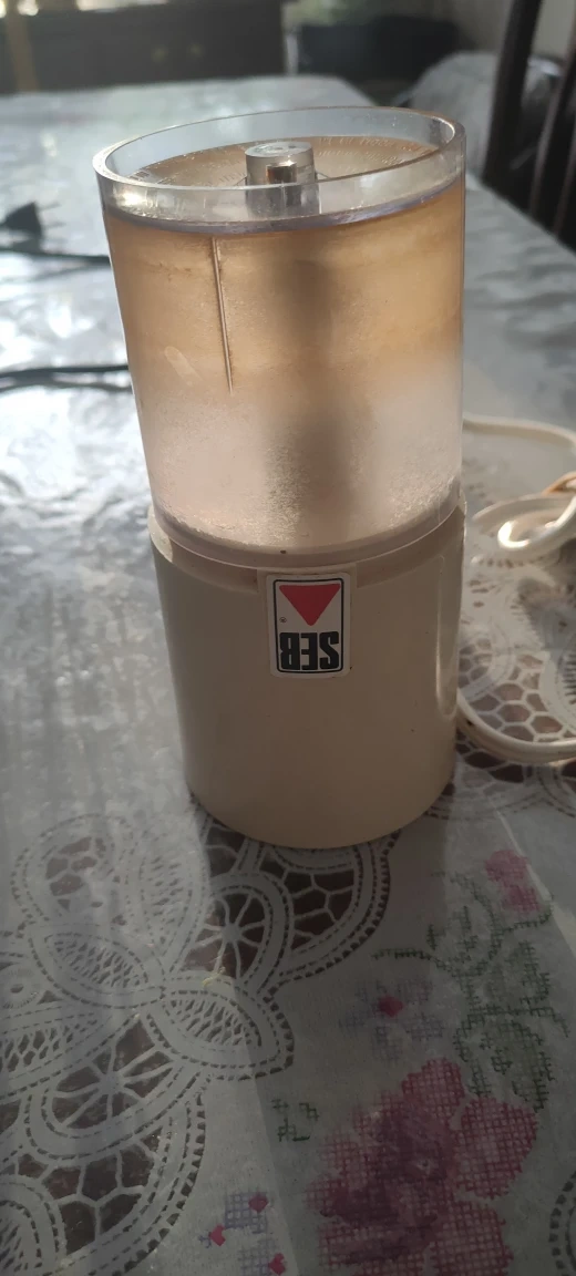 Small vintage grinder. Clear plastic top, beige base. Cord included. Shows some minor wear.