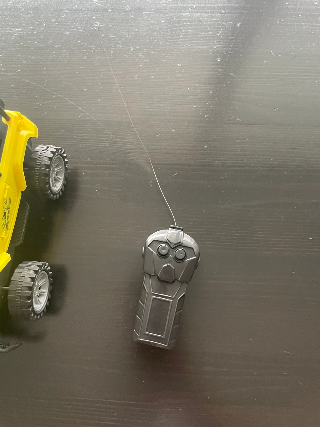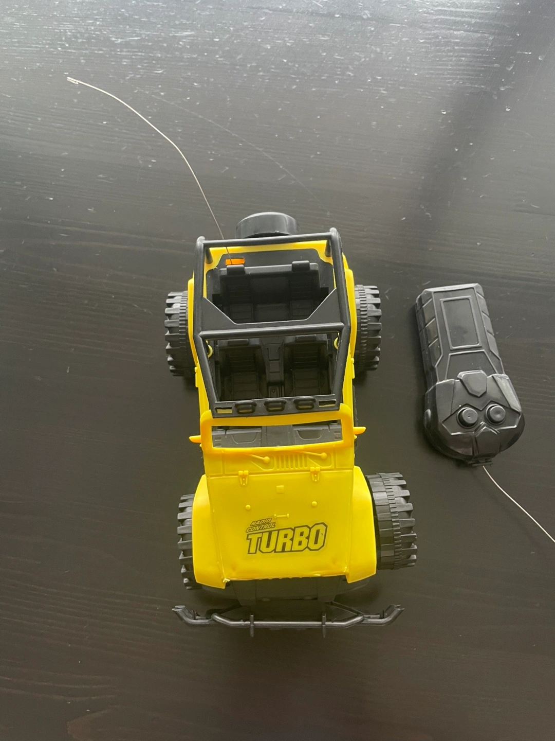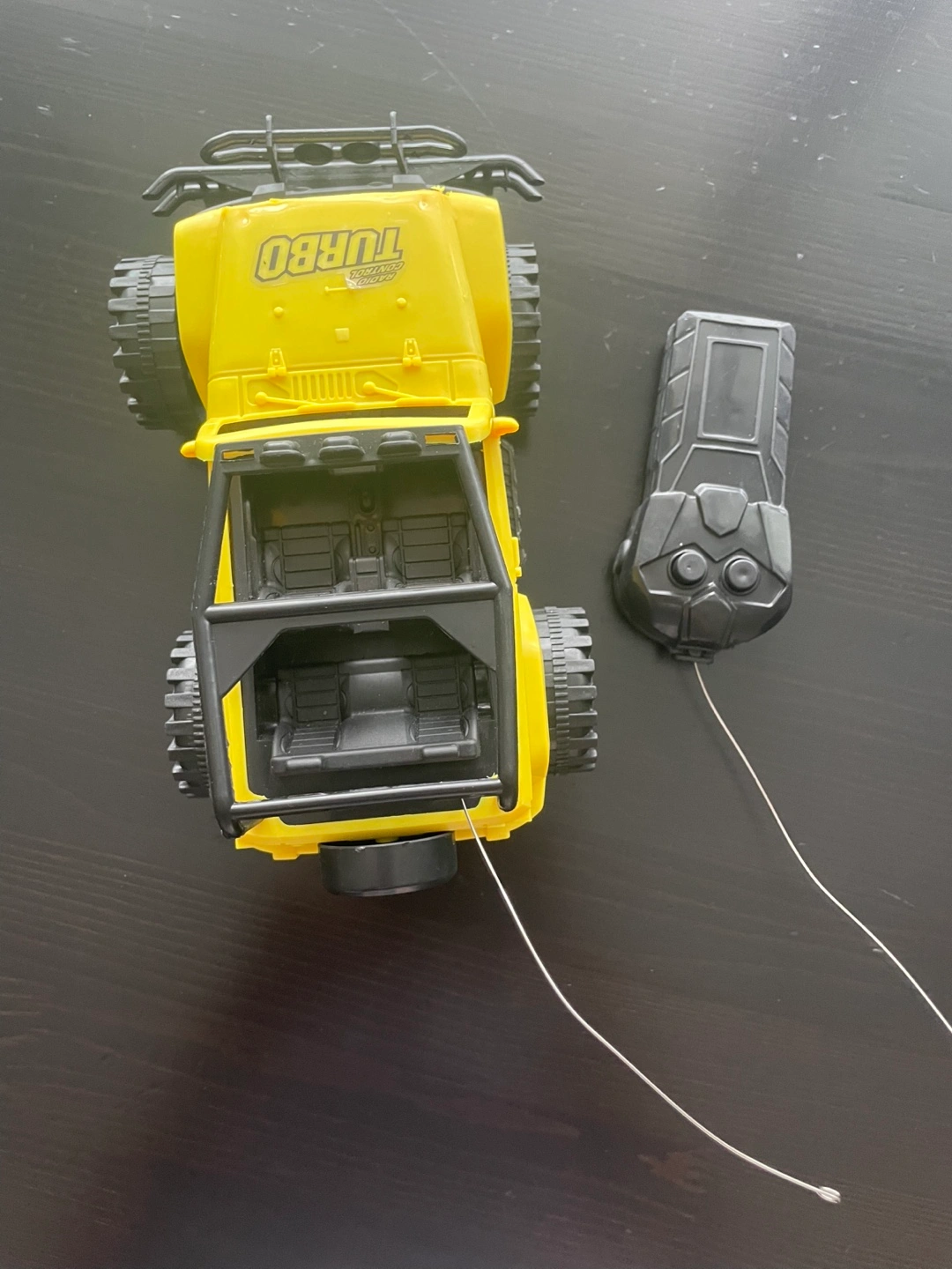 Yellow remote control toy car. Features a roll cage and large tires. Includes a remote control. Pull-cord activation.