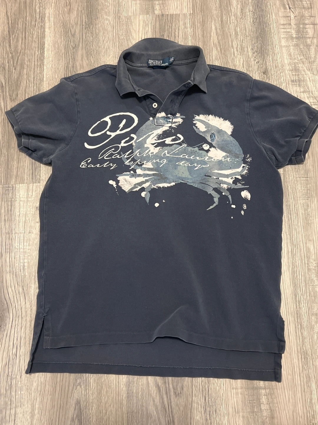 Men's short sleeve polo shirt. Dark navy colour. Features a crab graphic and text. Side slits. Size Large