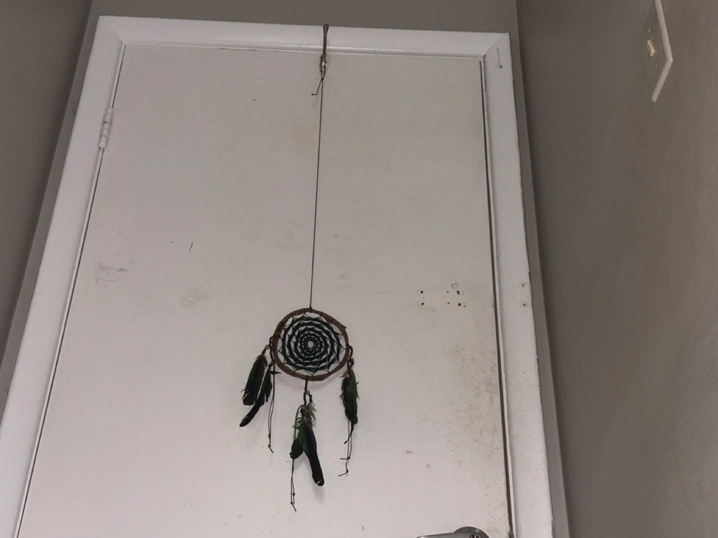 Small dream catcher. Features dark green and black feathers. Wooden ring. Hanging from a thin cord.