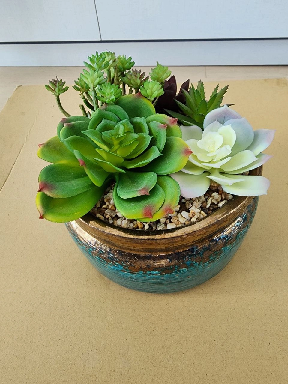 Beautiful artificial succulent arrangement. Planted in a teal ceramic pot with gold accents. perfect for any space.