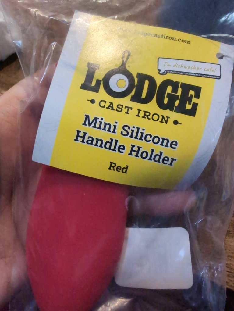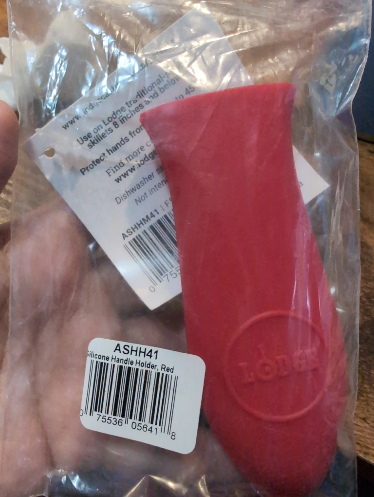 Red silicone handle holder. Fits Lodge cast iron skillets 8 inches and below. Dishwasher safe. Brand new. didn't fit my pan. Amazon making it unnecessarily difficult to return. I paid $9. Transactions are in cash only.