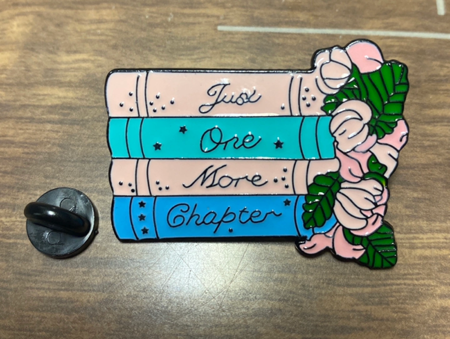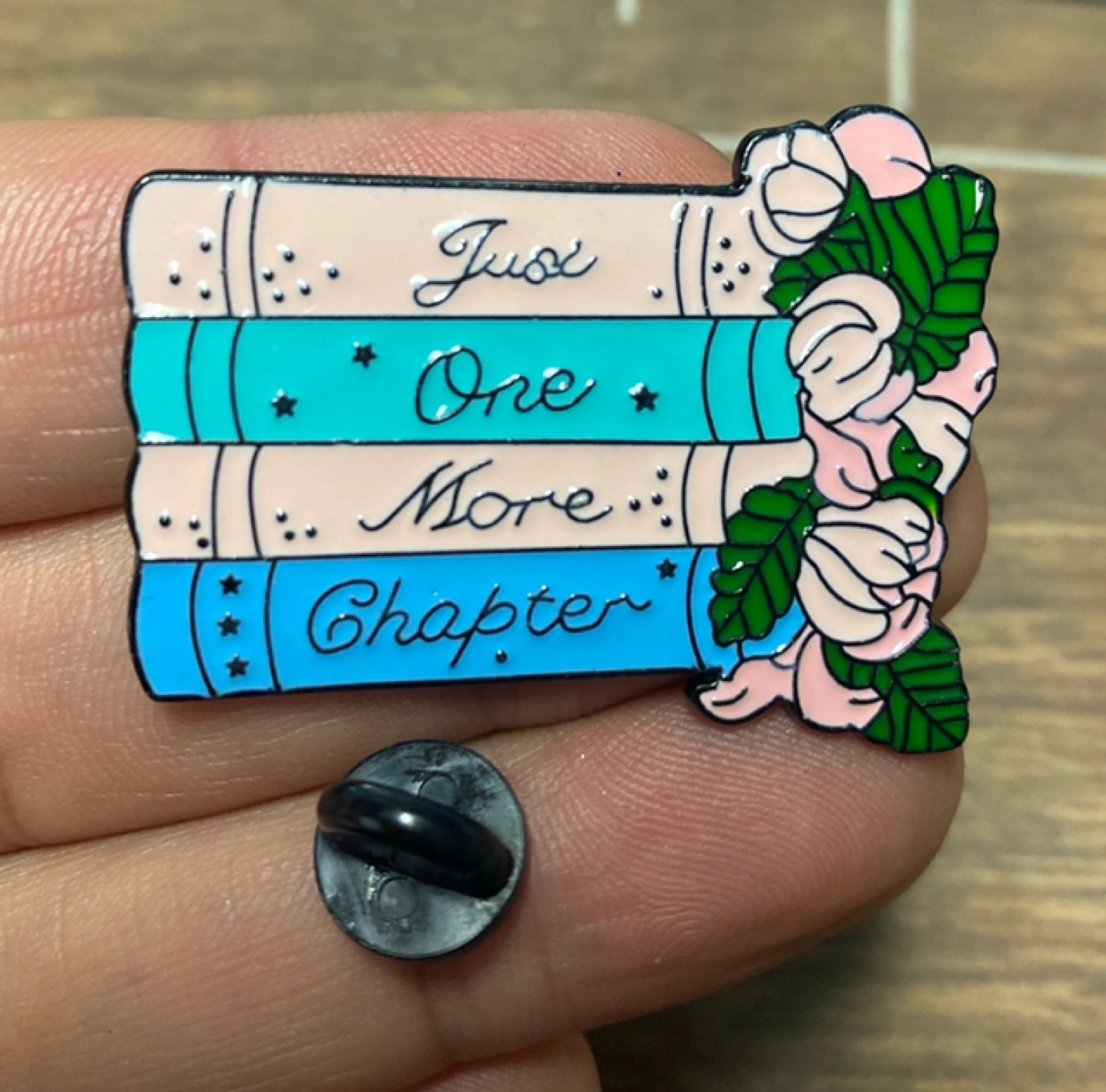 Adorable enamel pin featuring a stack of books with flowers. Perfect for book lovers. Includes pin back.