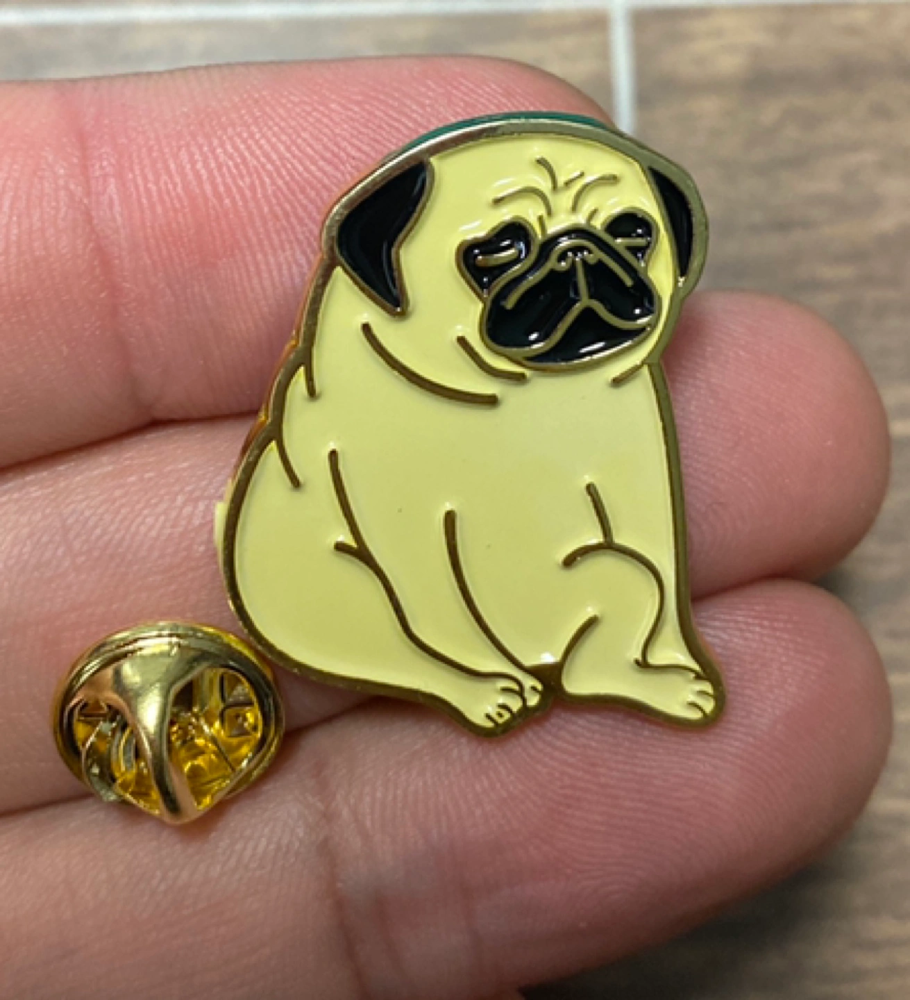 Cute enamel pin featuring a seated pug. Gold-coloured metal. Includes pin backing. Perfect for bags, jackets, or hats.