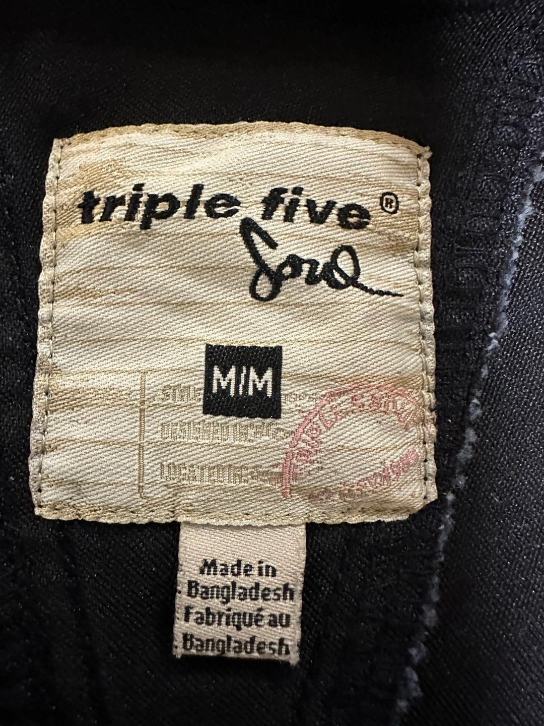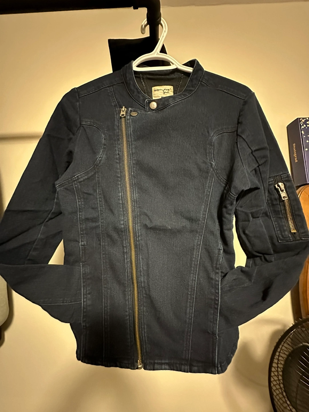 Dark wash denim jacket. Asymmetrical zipper closure. Long sleeves with zippered pockets. Stand collar. Made in Bangladesh.