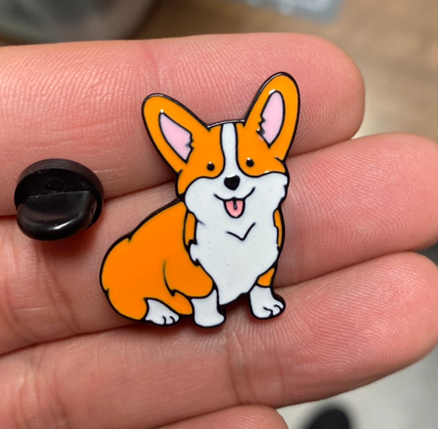 Cute enamel pin featuring a corgi. Perfect for bags, jackets, or hats. Includes a metal clutch back.