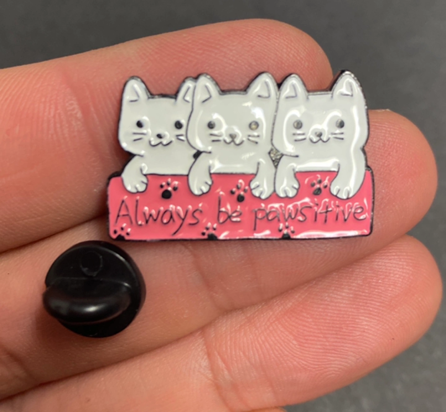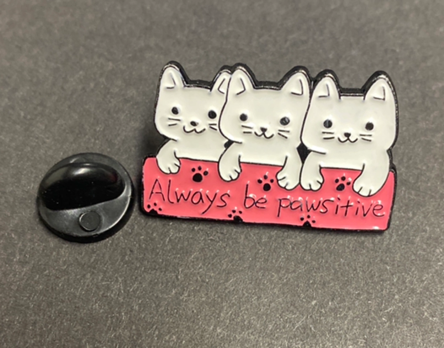 Adorable enamel pin featuring three cute white kittens sitting on a pink banner. Says "Always be pawsitive". Includes black butterfly clutch.