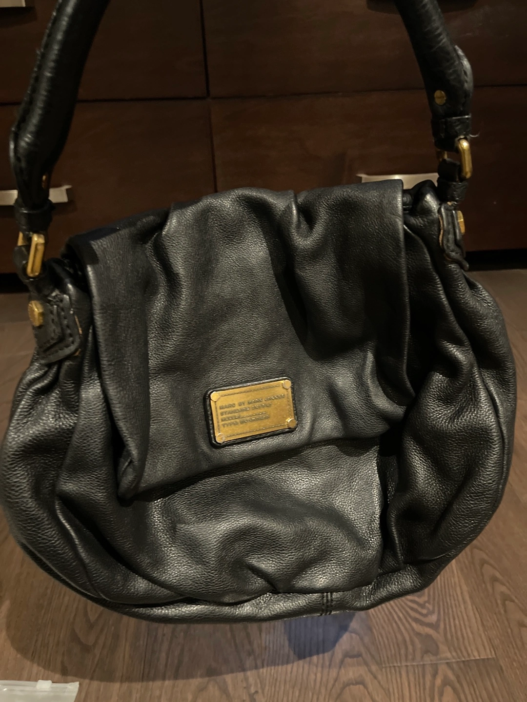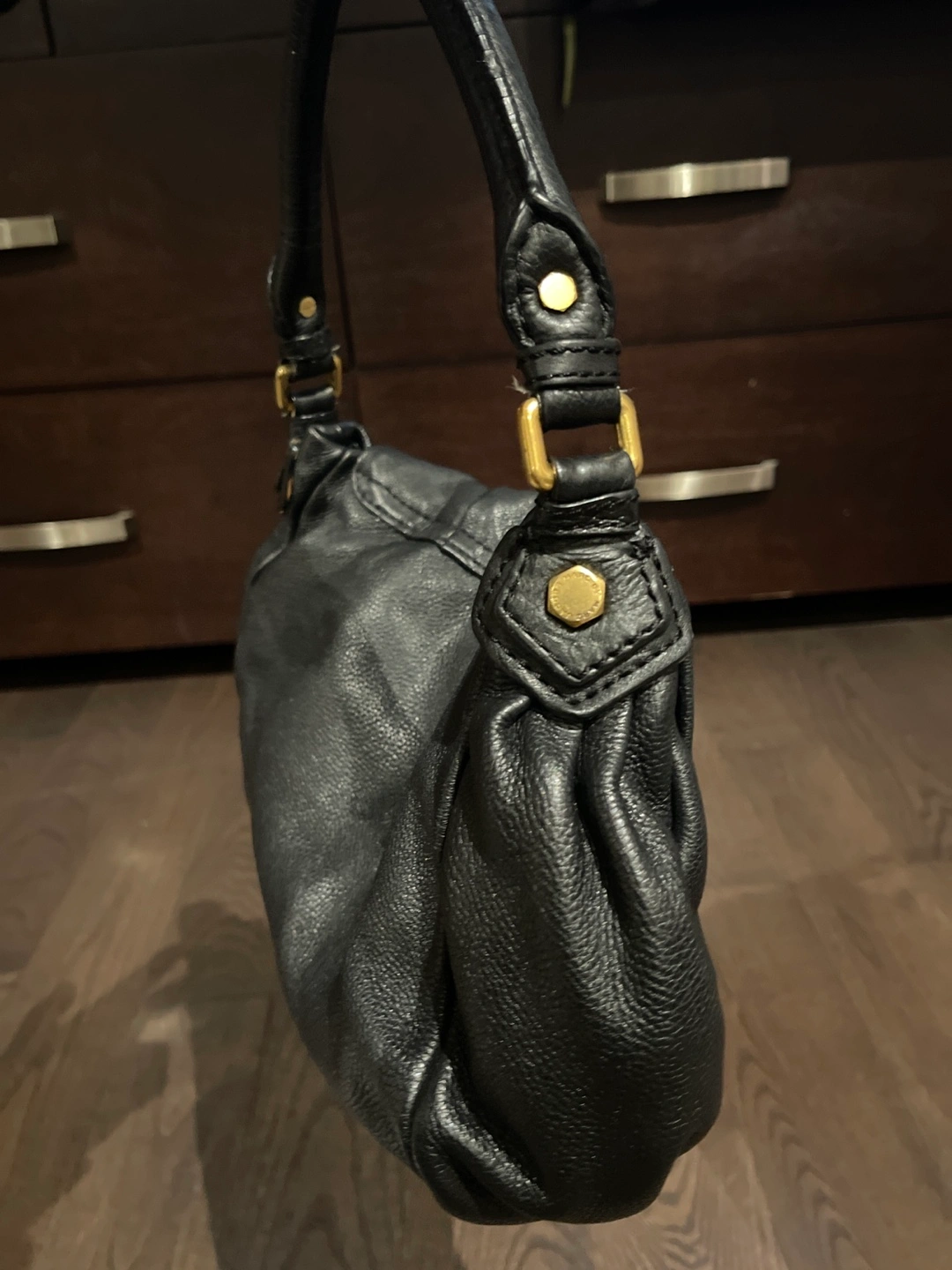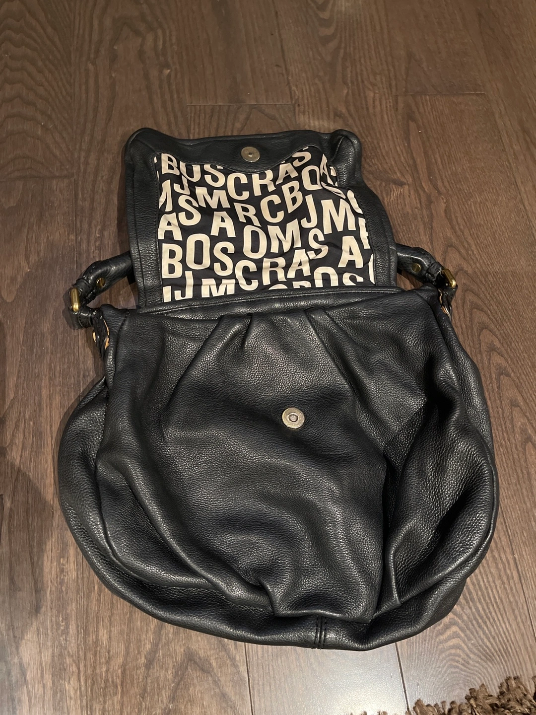 Pre owned Black leather shoulder bag. Gold-tone hardware. Interior fabric features a repeating Marc Jacobs logo print.