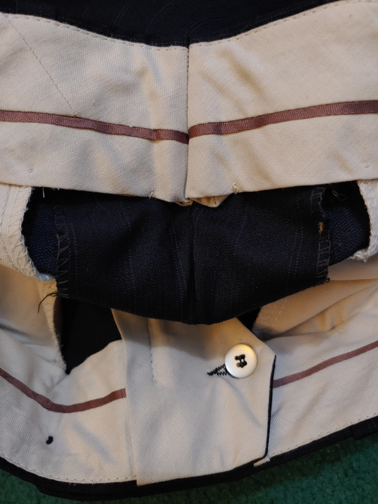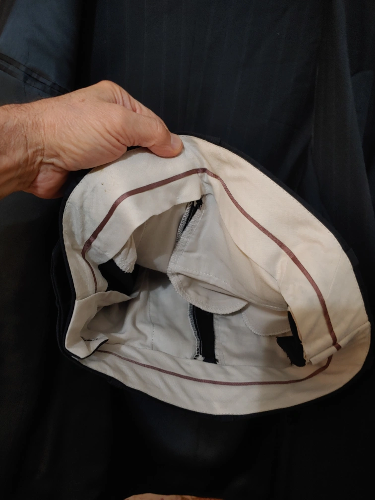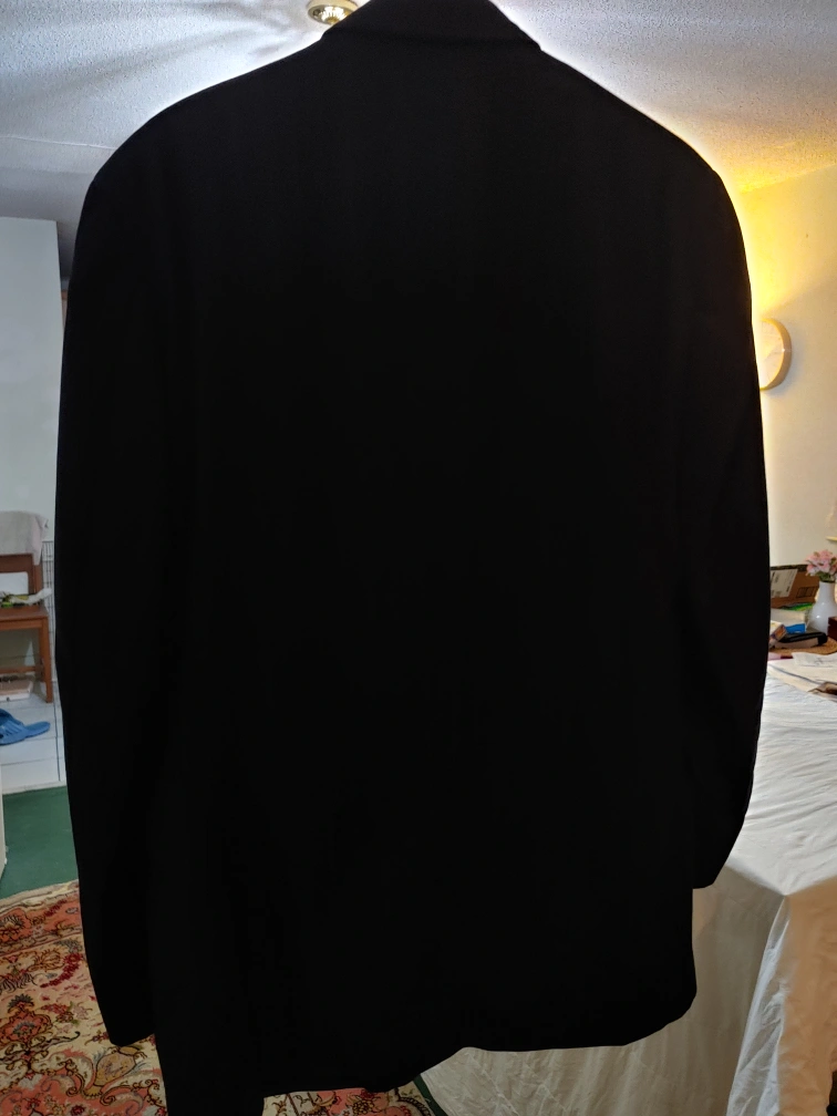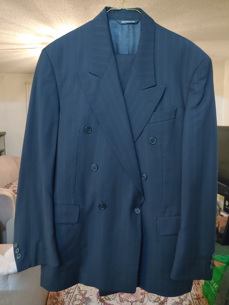 Dark navy pinstripe suit. Double-breasted jacket. 100% wool. Made in Canada. Includes jacket and trousers.