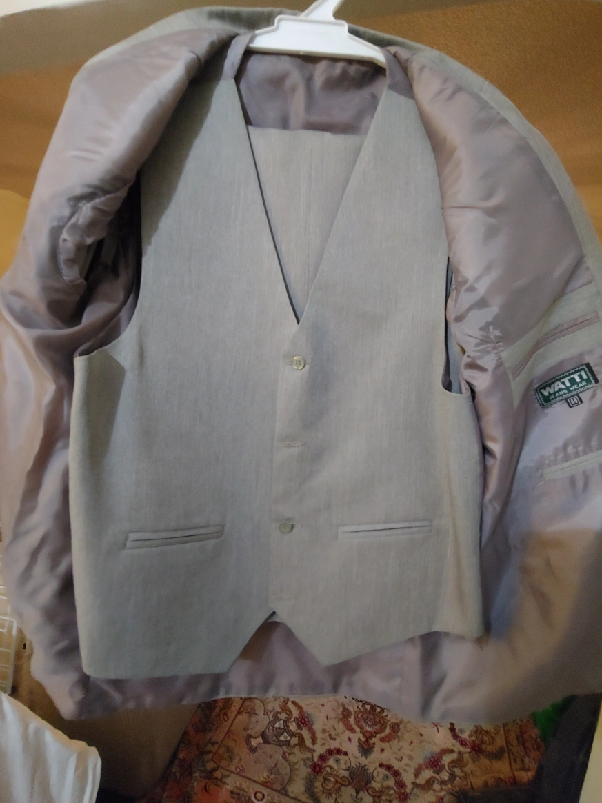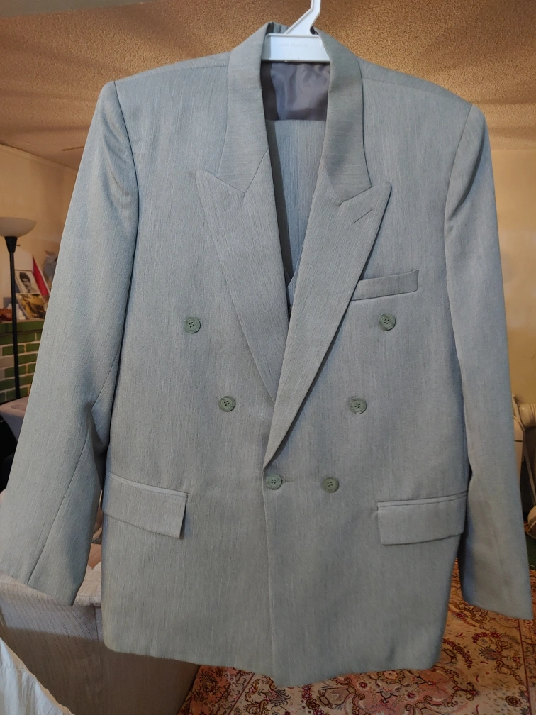 Men's three-piece suit. Light grey premium quality, double-breasted jacket, matching trousers, and vest. Size 46.