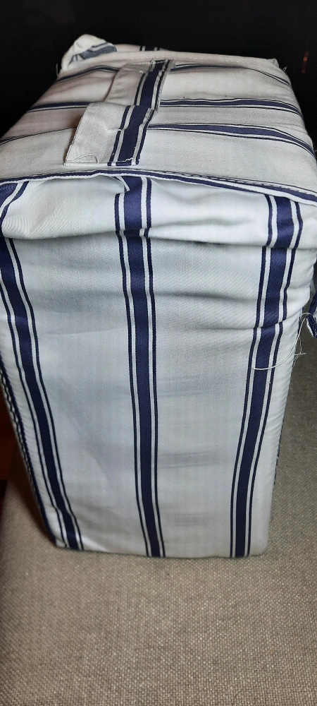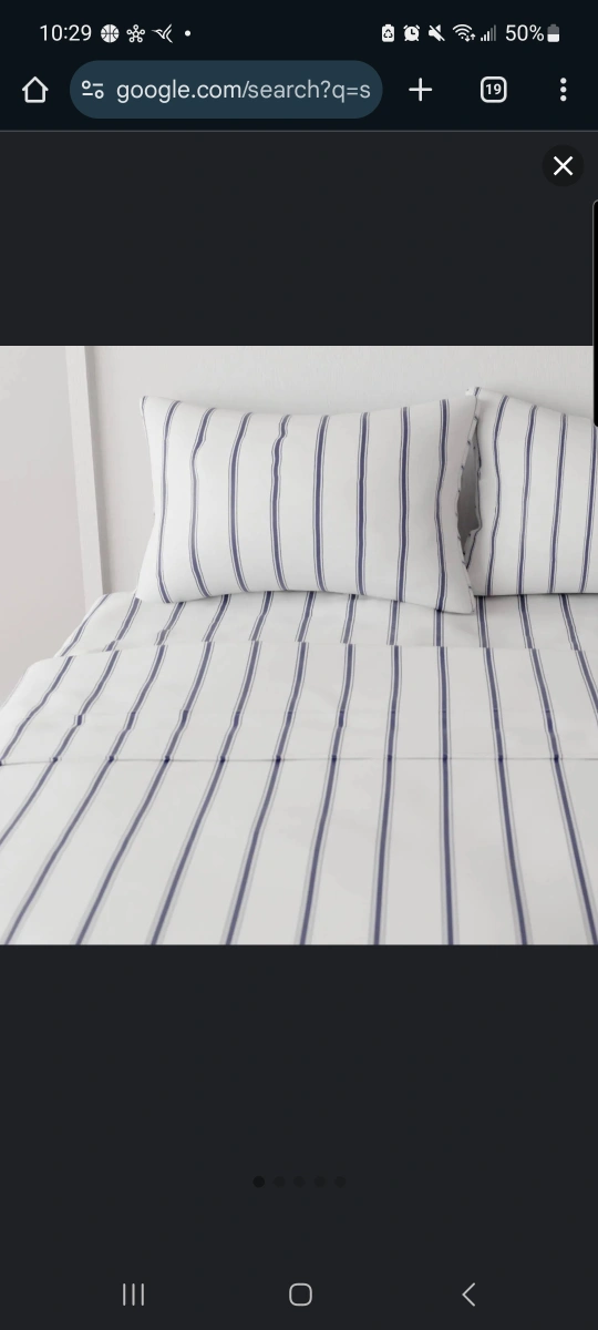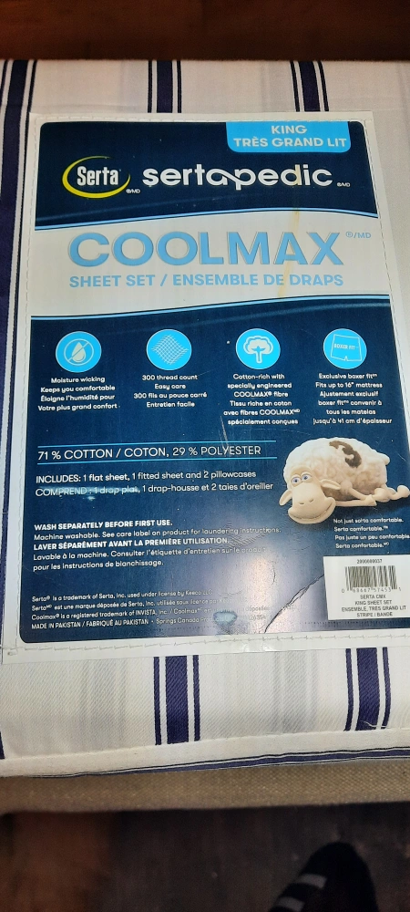 Brand New never used Serta Coolmax King size sheet set. White with navy blue stripes. 300 thread count. Includes flat sheet, fitted sheet and two pillowcases. 71% cotton, 29% polyester. Was going to use them but opted to get something thicker. New sets retail for $70+