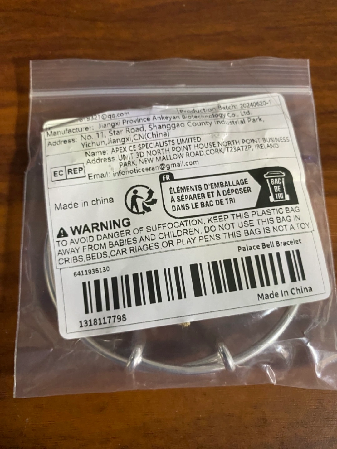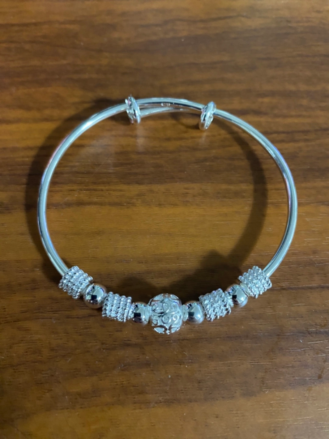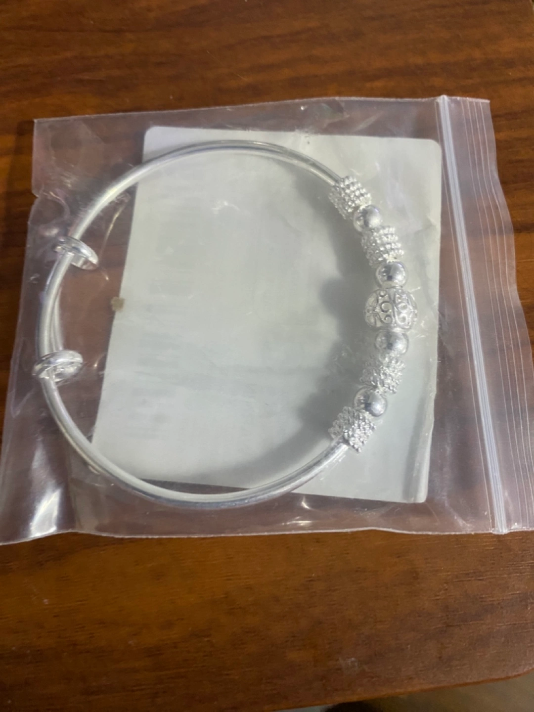 Adjustable silver bangle bracelet. Features small decorative charms. Packaged in a clear plastic bag. Pick up near 401 & Kennedy