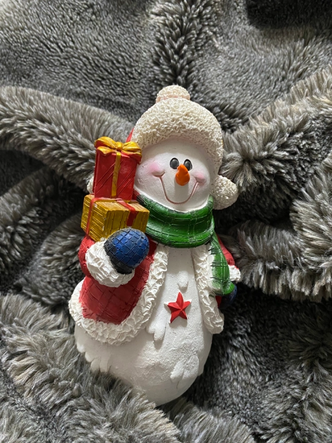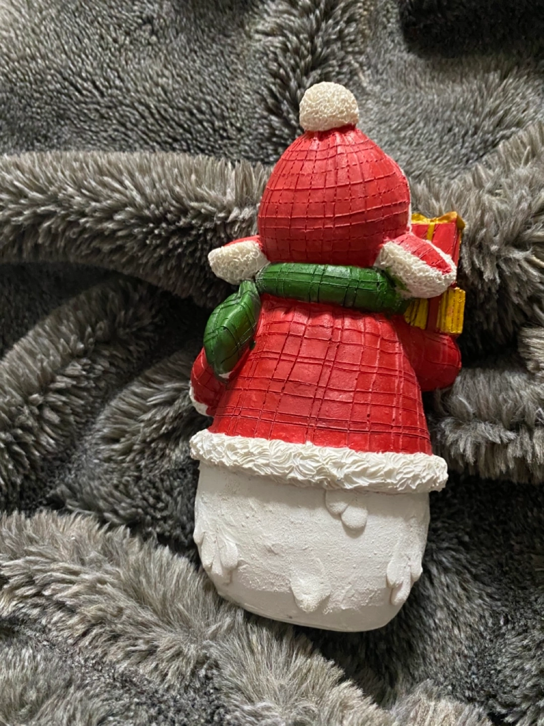 Cute snowman figurine. Perfect Christmas decoration. Holding presents. Red and white. Green scarf. Free with pickup near 401 & Kennedy